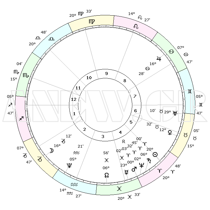 | | ΘΕΣΕΙΣ ΠΛΑΝΗΤΩΝ ΑΣΤΡΟΛΟΓΙΚΟΥ ΧΑΡΤΗ ΤΗΣ ΣΤΙΓΜΗΣ ΑΥΤΗΣ | | | | Πλανήτης | Ζώδιο | Μοίρες | Δεκαήμ. | Σε οίκο | Απόκλιση | | Ακμές των οίκων | | Ηλιος | Κριός | 19°23' | Δεύτερο | 12 | 07 N 35 | | 1ος | 18°53' | Ταύρος | | Σελήνη | Αιγόκερως | 08°37' | Πρώτο | 9 | 27 S 36 | | 2ος | 16°09' | Δίδυμοι | | Ερμής | Ιχθείς | 22°15' | Τρίτο | 11 | 05 S 10 | | 3ος | 08°08' | Καρκίνος | | Αφροδίτη | Ταύρος | 11°45' | Δεύτερο | 12 | 15 N 16 | | 4ος | 00°15' | Λέων | | Αρης | Ιχθείς | 29°33' | Τρίτο | 11 | 01 S 06 | | 5ος | 26°56' | Λέων | | Δίας | Καρκίνος | 16°25' | Δεύτερο | 3 | 22 N 48 | | 6ος | 03°25' | Ζυγός | | Κρόνος | Κριός | 06°41' | Πρώτο | 12 | 00 N 41 | | 7ος | 18°53' | Σκορπιός | | Ουρανός | Ταύρος | 29°08' | Τρίτο | 1 | 19 N 48 | | 8ος | 16°09' | Τοξότης | | Ποσειδώνας | Κριός | 02°31' | Πρώτο | 11 | 00 S 12 | | 9ος | 08°08' | Αιγόκερως | | Πλούτωνας | Υδροχόος | 05°20' | Πρώτο | 10 | 22 S 47 | | 10ος | 00°15' | Υδροχόος | | Β. Δεσμός | Ιχθείς | 06°58' | Πρώτο | 11 | 08 S 57 | | 11ος | 26°56' | Υδροχόος | | Ωροσκόπος | Ταύρος | 18°53' | Δεύτερο | | | 12ος | 03°25' | Κριός | | Μεσουράνημα | Υδροχόος | 00°15' | Πρώτο | | | |