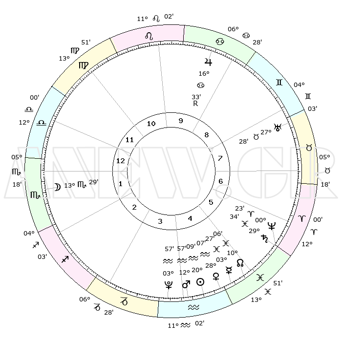 | | ΘΕΣΕΙΣ ΠΛΑΝΗΤΩΝ ΑΣΤΡΟΛΟΓΙΚΟΥ ΧΑΡΤΗ ΤΗΣ ΣΤΙΓΜΗΣ ΑΥΤΗΣ | | | | Πλανήτης | Ζώδιο | Μοίρες | Δεκαήμ. | Σε οίκο | Απόκλιση | | Ακμές των οίκων | | Ηλιος | Υδροχόος | 19°30' | Δεύτερο | 12 | 14 S 58 | | 1ος | 12°21' | Ιχθείς | | Σελήνη | Σκορπιός | 05°41' | Πρώτο | 8 | 17 S 33 | | 2ος | 26°16' | Κριός | | Ερμής | Ιχθείς | 02°19' | Πρώτο | 12 | 11 S 44 | | 3ος | 26°38' | Ταύρος | | Αφροδίτη | Υδροχόος | 27°18' | Τρίτο | 12 | 13 S 46 | | 4ος | 19°58' | Δίδυμοι | | Αρης | Υδροχόος | 12°26' | Δεύτερο | 12 | 18 S 05 | | 5ος | 11°44' | Καρκίνος | | Δίας | Καρκίνος | 16°36'R | Δεύτερο | 5 | 22 N 43 | | 6ος | 06°42' | Λέων | | Κρόνος | Ιχθείς | 29°30' | Τρίτο | 1 | 02 S 11 | | 7ος | 12°21' | Παρθένος | | Ουρανός | Ταύρος | 27°28' | Τρίτο | 3 | 19 N 24 | | 8ος | 26°16' | Ζυγός | | Ποσειδώνας | Κριός | 00°21' | Πρώτο | 1 | 01 S 04 | | 9ος | 26°38' | Σκορπιός | | Πλούτωνας | Υδροχόος | 03°56' | Πρώτο | 11 | 22 S 59 | | 10ος | 19°58' | Τοξότης | | Β. Δεσμός | Ιχθείς | 10°09' | Δεύτερο | 12 | 07 S 46 | | 11ος | 11°44' | Αιγόκερως | | Ωροσκόπος | Ιχθείς | 12°21' | Δεύτερο | | | 12ος | 06°42' | Υδροχόος | | Μεσουράνημα | Τοξότης | 19°58' | Δεύτερο | | | |