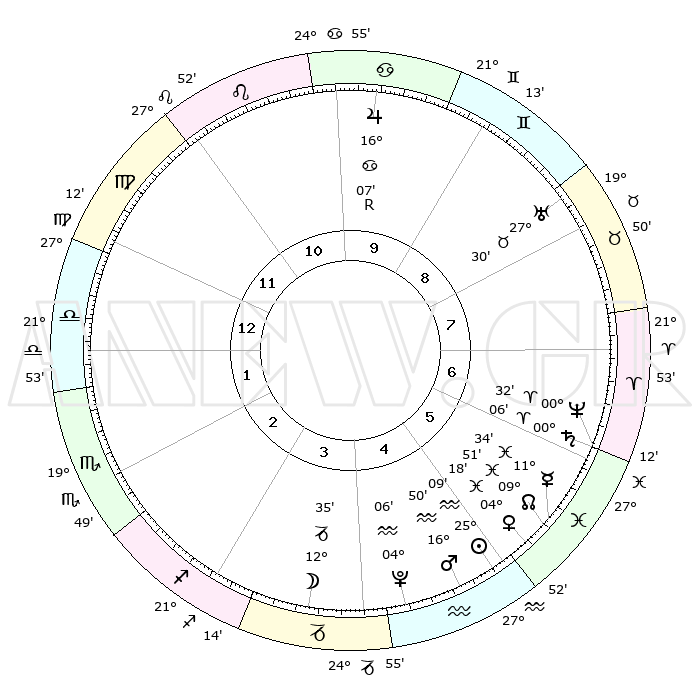 | | ΘΕΣΕΙΣ ΠΛΑΝΗΤΩΝ ΑΣΤΡΟΛΟΓΙΚΟΥ ΧΑΡΤΗ ΤΗΣ ΣΤΙΓΜΗΣ ΑΥΤΗΣ | | | | Πλανήτης | Ζώδιο | Μοίρες | Δεκαήμ. | Σε οίκο | Απόκλιση | | Ακμές των οίκων | | Ηλιος | Υδροχόος | 25°05' | Τρίτο | 5 | 13 S 09 | | 1ος | 03°06' | Ζυγός | | Σελήνη | Αιγόκερως | 11°48' | Δεύτερο | 4 | 27 S 19 | | 2ος | 29°54' | Ζυγός | | Ερμής | Ιχθείς | 11°28' | Δεύτερο | 6 | 07 S 27 | | 3ος | 00°27' | Τοξότης | | Αφροδίτη | Ιχθείς | 04°14' | Πρώτο | 5 | 11 S 19 | | 4ος | 03°29' | Αιγόκερως | | Αρης | Υδροχόος | 16°47' | Δεύτερο | 5 | 16 S 50 | | 5ος | 06°26' | Υδροχόος | | Δίας | Καρκίνος | 16°07'R | Δεύτερο | 10 | 22 N 47 | | 6ος | 06°44' | Ιχθείς | | Κρόνος | Κριός | 00°06' | Πρώτο | 6 | 01 S 56 | | 7ος | 03°06' | Κριός | | Ουρανός | Ταύρος | 27°30' | Τρίτο | 8 | 19 N 25 | | 8ος | 29°54' | Κριός | | Ποσειδώνας | Κριός | 00°32' | Πρώτο | 6 | 01 S 00 | | 9ος | 00°27' | Δίδυμοι | | Πλούτωνας | Υδροχόος | 04°06' | Πρώτο | 4 | 22 S 57 | | 10ος | 03°29' | Καρκίνος | | Β. Δεσμός | Ιχθείς | 09°51' | Πρώτο | 6 | 07 S 52 | | 11ος | 06°26' | Λέων | | Ωροσκόπος | Ζυγός | 03°06' | Πρώτο | | | 12ος | 06°44' | Παρθένος | | Μεσουράνημα | Καρκίνος | 03°29' | Πρώτο | | | |