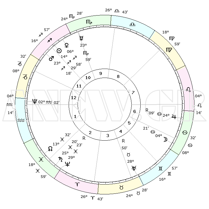 | | ΘΕΣΕΙΣ ΠΛΑΝΗΤΩΝ ΑΣΤΡΟΛΟΓΙΚΟΥ ΧΑΡΤΗ ΤΗΣ ΣΤΙΓΜΗΣ ΑΥΤΗΣ | | | | Πλανήτης | Ζώδιο | Μοίρες | Δεκαήμ. | Σε οίκο | Απόκλιση | | Ακμές των οίκων | | Ηλιος | Τοξότης | 14°59' | Δεύτερο | 4 | 22 S 35 | | 1ος | 27°59' | Λέων | | Σελήνη | Καρκίνος | 11°44' | Δεύτερο | 11 | 27 N 18 | | 2ος | 21°37' | Παρθένος | | Ερμής | Σκορπιός | 24°26' | Τρίτο | 4 | 16 S 32 | | 3ος | 20°06' | Ζυγός | | Αφροδίτη | Τοξότης | 07°35' | Πρώτο | 4 | 21 S 05 | | 4ος | 22°60' | Σκορπιός | | Αρης | Τοξότης | 23°40' | Τρίτο | 4 | 24 S 00 | | 5ος | 27°19' | Τοξότης | | Δίας | Καρκίνος | 24°07'R | Τρίτο | 11 | 21 N 27 | | 6ος | 29°27' | Αιγόκερως | | Κρόνος | Ιχθείς | 25°21' | Τρίτο | 8 | 04 S 00 | | 7ος | 27°59' | Υδροχόος | | Ουρανός | Ταύρος | 28°48'R | Τρίτο | 10 | 19 N 41 | | 8ος | 21°37' | Ιχθείς | | Ποσειδώνας | Ιχθείς | 29°23'R | Τρίτο | 8 | 01 S 29 | | 9ος | 20°06' | Κριός | | Πλούτωνας | Υδροχόος | 02°02' | Πρώτο | 6 | 23 S 22 | | 10ος | 22°60' | Ταύρος | | Β. Δεσμός | Ιχθείς | 13°30' | Δεύτερο | 7 | 06 S 29 | | 11ος | 27°19' | Δίδυμοι | | Ωροσκόπος | Λέων | 27°59' | Τρίτο | | | 12ος | 29°27' | Καρκίνος | | Μεσουράνημα | Ταύρος | 22°60' | Τρίτο | | | |