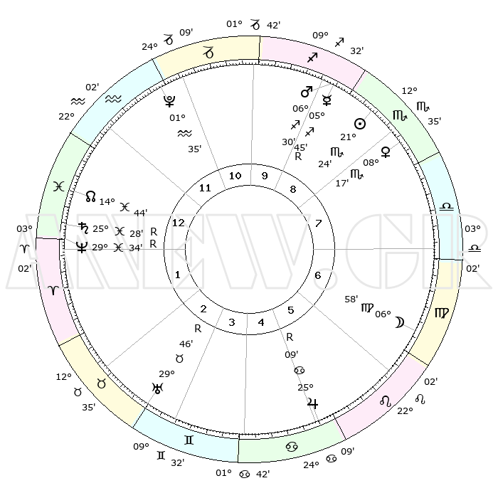 | | ΘΕΣΕΙΣ ΠΛΑΝΗΤΩΝ ΑΣΤΡΟΛΟΓΙΚΟΥ ΧΑΡΤΗ ΤΗΣ ΣΤΙΓΜΗΣ ΑΥΤΗΣ | | | | Πλανήτης | Ζώδιο | Μοίρες | Δεκαήμ. | Σε οίκο | Απόκλιση | | Ακμές των οίκων | | Ηλιος | Σκορπιός | 21°20' | Τρίτο | 9 | 18 S 05 | | 1ος | 22°18' | Υδροχόος | | Σελήνη | Παρθένος | 06°04' | Πρώτο | 7 | 10 N 07 | | 2ος | 08°06' | Κριός | | Ερμής | Τοξότης | 05°48'R | Πρώτο | 9 | 22 S 52 | | 3ος | 12°21' | Ταύρος | | Αφροδίτη | Σκορπιός | 08°11' | Πρώτο | 8 | 13 S 03 | | 4ος | 07°35' | Δίδυμοι | | Αρης | Τοξότης | 06°27' | Πρώτο | 9 | 21 S 53 | | 5ος | 29°21' | Δίδυμοι | | Δίας | Καρκίνος | 25°09'R | Τρίτο | 6 | 21 N 13 | | 6ος | 22°11' | Καρκίνος | | Κρόνος | Ιχθείς | 25°29'R | Τρίτο | 1 | 04 S 02 | | 7ος | 22°18' | Λέων | | Ουρανός | Ταύρος | 29°46'R | Τρίτο | 3 | 19 N 54 | | 8ος | 08°06' | Ζυγός | | Ποσειδώνας | Ιχθείς | 29°34'R | Τρίτο | 1 | 01 S 25 | | 9ος | 12°21' | Σκορπιός | | Πλούτωνας | Υδροχόος | 01°35' | Πρώτο | 12 | 23 S 29 | | 10ος | 07°35' | Τοξότης | | Β. Δεσμός | Ιχθείς | 14°44' | Δεύτερο | 1 | 06 S 00 | | 11ος | 29°21' | Τοξότης | | Ωροσκόπος | Υδροχόος | 22°18' | Τρίτο | | | 12ος | 22°11' | Αιγόκερως | | Μεσουράνημα | Τοξότης | 07°35' | Πρώτο | | | |