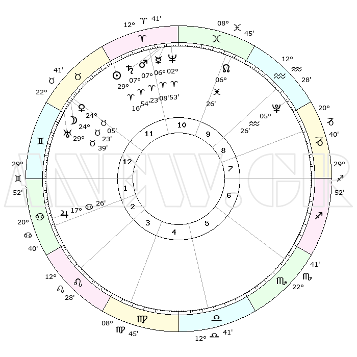 | | ΘΕΣΕΙΣ ΠΛΑΝΗΤΩΝ ΑΣΤΡΟΛΟΓΙΚΟΥ ΧΑΡΤΗ ΤΗΣ ΣΤΙΓΜΗΣ ΑΥΤΗΣ | | | | Πλανήτης | Ζώδιο | Μοίρες | Δεκαήμ. | Σε οίκο | Απόκλιση | | Ακμές των οίκων | | Ηλιος | Κριός | 28°53' | Τρίτο | 4 | 11 N 04 | | 1ος | 29°19' | Τοξότης | | Σελήνη | Ταύρος | 18°31' | Δεύτερο | 5 | 21 N 58 | | 2ος | 06°17' | Υδροχόος | | Ερμής | Κριός | 05°32' | Πρώτο | 3 | 00 S 13 | | 3ος | 16°14' | Ιχθείς | | Αφροδίτη | Ταύρος | 23°36' | Τρίτο | 5 | 19 N 01 | | 4ος | 20°17' | Κριός | | Αρης | Κριός | 07°04' | Πρώτο | 3 | 01 N 55 | | 5ος | 16°43' | Ταύρος | | Δίας | Καρκίνος | 17°23' | Δεύτερο | 7 | 22 N 41 | | 6ος | 08°34' | Δίδυμοι | | Κρόνος | Κριός | 07°51' | Πρώτο | 3 | 01 N 08 | | 7ος | 29°19' | Δίδυμοι | | Ουρανός | Ταύρος | 29°37' | Τρίτο | 5 | 19 N 54 | | 8ος | 06°17' | Λέων | | Ποσειδώνας | Κριός | 02°52' | Πρώτο | 3 | 00 S 04 | | 9ος | 16°14' | Παρθένος | | Πλούτωνας | Υδροχόος | 05°26' | Πρώτο | 1 | 22 S 47 | | 10ος | 20°17' | Ζυγός | | Β. Δεσμός | Ιχθείς | 06°27' | Πρώτο | 2 | 09 S 08 | | 11ος | 16°43' | Σκορπιός | | Ωροσκόπος | Τοξότης | 29°19' | Τρίτο | | | 12ος | 08°34' | Τοξότης | | Μεσουράνημα | Ζυγός | 20°17' | Τρίτο | | | |