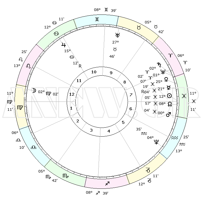 | | ΘΕΣΕΙΣ ΠΛΑΝΗΤΩΝ ΑΣΤΡΟΛΟΓΙΚΟΥ ΧΑΡΤΗ ΤΗΣ ΣΤΙΓΜΗΣ ΑΥΤΗΣ | | | | Πλανήτης | Ζώδιο | Μοίρες | Δεκαήμ. | Σε οίκο | Απόκλιση | | Ακμές των οίκων | | Ηλιος | Ιχθείς | 11°47' | Δεύτερο | 10 | 07 S 09 | | 1ος | 04°17' | Δίδυμοι | | Σελήνη | Λέων | 27°51' | Τρίτο | 4 | 13 N 11 | | 2ος | 28°16' | Δίδυμοι | | Ερμής | Ιχθείς | 21°15'R | Τρίτο | 11 | 00 S 16 | | 3ος | 19°33' | Καρκίνος | | Αφροδίτη | Ιχθείς | 24°56' | Τρίτο | 11 | 03 S 15 | | 4ος | 12°39' | Λέων | | Αρης | Υδροχόος | 29°50' | Τρίτο | 10 | 12 S 33 | | 5ος | 11°53' | Παρθένος | | Δίας | Καρκίνος | 15°13'R | Δεύτερο | 2 | 22 N 55 | | 6ος | 20°57' | Ζυγός | | Κρόνος | Κριός | 02°00' | Πρώτο | 11 | 01 S 10 | | 7ος | 04°17' | Τοξότης | | Ουρανός | Ταύρος | 27°46' | Τρίτο | 12 | 19 N 29 | | 8ος | 28°16' | Τοξότης | | Ποσειδώνας | Κριός | 01°06' | Πρώτο | 11 | 00 S 46 | | 9ος | 19°33' | Αιγόκερως | | Πλούτωνας | Υδροχόος | 04°34' | Πρώτο | 9 | 22 S 52 | | 10ος | 12°39' | Υδροχόος | | Β. Δεσμός | Ιχθείς | 08°58' | Πρώτο | 10 | 08 S 12 | | 11ος | 11°53' | Ιχθείς | | Ωροσκόπος | Δίδυμοι | 04°17' | Πρώτο | | | 12ος | 20°57' | Κριός | | Μεσουράνημα | Υδροχόος | 12°39' | Δεύτερο | | | |