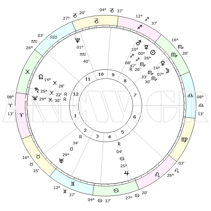 | | ΘΕΣΕΙΣ ΠΛΑΝΗΤΩΝ ΑΣΤΡΟΛΟΓΙΚΟΥ ΧΑΡΤΗ ΤΗΣ ΣΤΙΓΜΗΣ ΑΥΤΗΣ | | | | Πλανήτης | Ζώδιο | Μοίρες | Δεκαήμ. | Σε οίκο | Απόκλιση | | Ακμές των οίκων | | Ηλιος | Σκορπιός | 26°22' | Τρίτο | 9 | 19 S 20 | | 1ος | 00°13' | Ιχθείς | | Σελήνη | Σκορπιός | 06°43' | Πρώτο | 8 | 17 S 26 | | 2ος | 15°37' | Κριός | | Ερμής | Τοξότης | 00°53'R | Πρώτο | 9 | 20 S 26 | | 3ος | 18°18' | Ταύρος | | Αφροδίτη | Σκορπιός | 14°28' | Δεύτερο | 8 | 15 S 07 | | 4ος | 12°40' | Δίδυμοι | | Αρης | Τοξότης | 10°05' | Δεύτερο | 9 | 22 S 30 | | 5ος | 04°21' | Καρκίνος | | Δίας | Καρκίνος | 25°04'R | Τρίτο | 5 | 21 N 14 | | 6ος | 27°56' | Καρκίνος | | Κρόνος | Ιχθείς | 25°22'R | Τρίτο | 1 | 04 S 03 | | 7ος | 00°13' | Παρθένος | | Ουρανός | Ταύρος | 29°34'R | Τρίτο | 3 | 19 N 51 | | 8ος | 15°37' | Ζυγός | | Ποσειδώνας | Ιχθείς | 29°30'R | Τρίτο | 1 | 01 S 27 | | 9ος | 18°18' | Σκορπιός | | Πλούτωνας | Υδροχόος | 01°40' | Πρώτο | 12 | 23 S 27 | | 10ος | 12°40' | Τοξότης | | Β. Δεσμός | Ιχθείς | 14°28' | Δεύτερο | 1 | 06 S 07 | | 11ος | 04°21' | Αιγόκερως | | Ωροσκόπος | Ιχθείς | 00°13' | Πρώτο | | | 12ος | 27°56' | Αιγόκερως | | Μεσουράνημα | Τοξότης | 12°40' | Δεύτερο | | | |