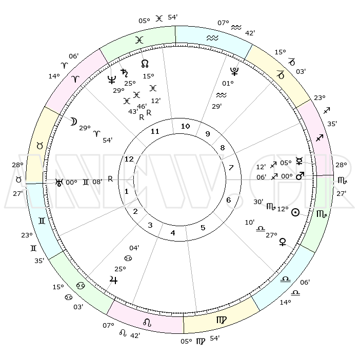 |  | ΘΕΣΕΙΣ ΠΛΑΝΗΤΩΝ ΑΣΤΡΟΛΟΓΙΚΟΥ ΧΑΡΤΗ ΤΗΣ ΣΤΙΓΜΗΣ ΑΥΤΗΣ |  |   |  | Πλανήτης | Ζώδιο | Μοίρες | Δεκαήμ. | Σε οίκο | Απόκλιση |   | Ακμές των οίκων |  | Ηλιος | Σκορπιός | 12°17' | Δεύτερο | 9 | 15 S 31 |   | 1ος | 02°46' | Υδροχόος |  | Σελήνη | Κριός | 26°35' | Τρίτο | 3 | 13 N 17 |   | 2ος | 17°18' | Ιχθείς |  | Ερμής | Τοξότης | 05°03' | Πρώτο | 10 | 23 S 56 |   | 3ος | 25°18' | Κριός |  | Αφροδίτη | Ζυγός | 26°54' | Τρίτο | 9 | 09 S 02 |   | 4ος | 23°18' | Ταύρος |  | Αρης | Σκορπιός | 29°57' | Τρίτο | 10 | 20 S 33 |   | 5ος | 15°52' | Δίδυμοι |  | Δίας | Καρκίνος | 25°04' | Τρίτο | 6 | 21 N 12 |   | 6ος | 07°23' | Καρκίνος |  | Κρόνος | Ιχθείς | 25°46'R | Τρίτο | 2 | 03 S 56 |   | 7ος | 02°46' | Λέων |  | Ουρανός | Δίδυμοι | 00°08'R | Πρώτο | 4 | 19 N 58 |   | 8ος | 17°18' | Παρθένος |  | Ποσειδώνας | Ιχθείς | 29°43'R | Τρίτο | 2 | 01 S 22 |   | 9ος | 25°18' | Ζυγός |  | Πλούτωνας | Υδροχόος | 01°29' | Πρώτο | 12 | 23 S 30 |   | 10ος | 23°18' | Σκορπιός |  | Β. Δεσμός | Ιχθείς | 15°13' | Δεύτερο | 1 | 05 S 49 |   | 11ος | 15°52' | Τοξότης |  | Ωροσκόπος | Υδροχόος | 02°46' | Πρώτο |   |   | 12ος | 07°23' | Αιγόκερως |  | Μεσουράνημα | Σκορπιός | 23°18' | Τρίτο |   |   |   |