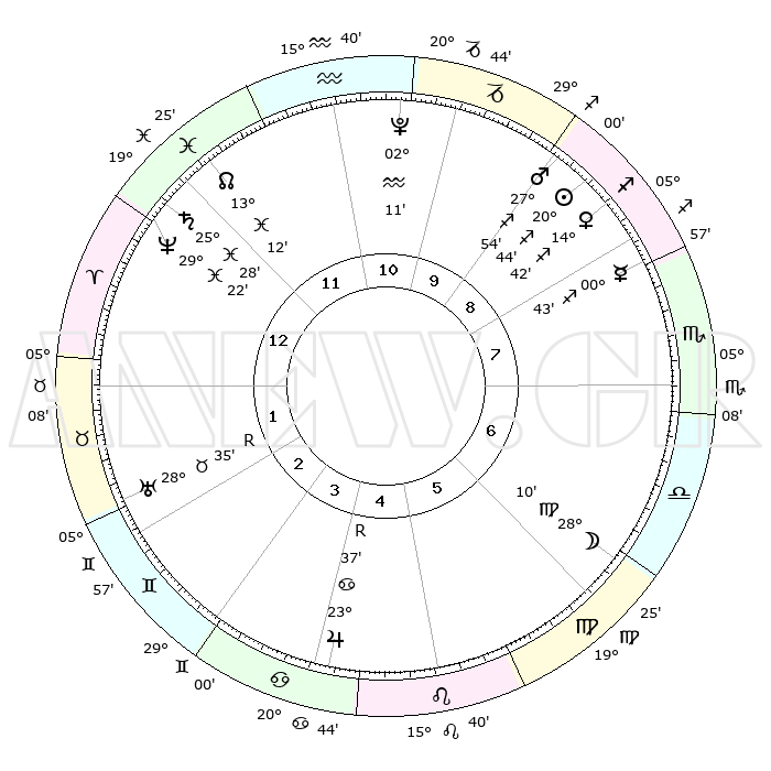 | | ΘΕΣΕΙΣ ΠΛΑΝΗΤΩΝ ΑΣΤΡΟΛΟΓΙΚΟΥ ΧΑΡΤΗ ΤΗΣ ΣΤΙΓΜΗΣ ΑΥΤΗΣ | | | | Πλανήτης | Ζώδιο | Μοίρες | Δεκαήμ. | Σε οίκο | Απόκλιση | | Ακμές των οίκων | | Ηλιος | Τοξότης | 20°39' | Τρίτο | 9 | 23 S 06 | | 1ος | 21°36' | Ιχθείς | | Σελήνη | Παρθένος | 27°14' | Τρίτο | 7 | 00 S 02 | | 2ος | 03°47' | Ταύρος | | Ερμής | Τοξότης | 00°38' | Πρώτο | 8 | 18 S 28 | | 3ος | 02°32' | Δίδυμοι | | Αφροδίτη | Τοξότης | 14°36' | Δεύτερο | 9 | 22 S 17 | | 4ος | 25°16' | Δίδυμοι | | Αρης | Τοξότης | 27°51' | Τρίτο | 10 | 24 S 10 | | 5ος | 17°16' | Καρκίνος | | Δίας | Καρκίνος | 23°37'R | Τρίτο | 5 | 21 N 33 | | 6ος | 13°26' | Λέων | | Κρόνος | Ιχθείς | 25°28' | Τρίτο | 1 | 03 S 56 | | 7ος | 21°36' | Παρθένος | | Ουρανός | Ταύρος | 28°36'R | Τρίτο | 2 | 19 N 39 | | 8ος | 03°47' | Σκορπιός | | Ποσειδώνας | Ιχθείς | 29°22' | Τρίτο | 1 | 01 S 29 | | 9ος | 02°32' | Τοξότης | | Πλούτωνας | Υδροχόος | 02°11' | Πρώτο | 11 | 23 S 20 | | 10ος | 25°16' | Τοξότης | | Β. Δεσμός | Ιχθείς | 13°12' | Δεύτερο | 12 | 06 S 36 | | 11ος | 17°16' | Αιγόκερως | | Ωροσκόπος | Ιχθείς | 21°36' | Τρίτο | | | 12ος | 13°26' | Υδροχόος | | Μεσουράνημα | Τοξότης | 25°16' | Τρίτο | | | |