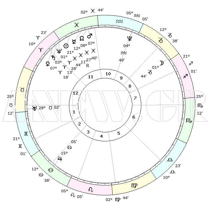 | | ΘΕΣΕΙΣ ΠΛΑΝΗΤΩΝ ΑΣΤΡΟΛΟΓΙΚΟΥ ΧΑΡΤΗ ΤΗΣ ΣΤΙΓΜΗΣ ΑΥΤΗΣ | | | | Πλανήτης | Ζώδιο | Μοίρες | Δεκαήμ. | Σε οίκο | Απόκλιση | | Ακμές των οίκων | | Ηλιος | Ιχθείς | 21°41' | Τρίτο | 12 | 03 S 18 | | 1ος | 21°54' | Κριός | | Σελήνη | Αιγόκερως | 00°56' | Πρώτο | 9 | 28 S 19 | | 2ος | 26°22' | Ταύρος | | Ερμής | Ιχθείς | 12°15'R | Δεύτερο | 12 | 04 S 11 | | 3ος | 20°49' | Δίδυμοι | | Αφροδίτη | Κριός | 07°13' | Πρώτο | 12 | 01 N 50 | | 4ος | 12°32' | Καρκίνος | | Αρης | Ιχθείς | 07°37' | Πρώτο | 12 | 09 S 43 | | 5ος | 06°12' | Λέων | | Δίας | Καρκίνος | 15°05' | Δεύτερο | 4 | 22 N 56 | | 6ος | 07°21' | Παρθένος | | Κρόνος | Κριός | 03°12' | Πρώτο | 12 | 00 S 41 | | 7ος | 21°54' | Ζυγός | | Ουρανός | Ταύρος | 28°02' | Τρίτο | 2 | 19 N 33 | | 8ος | 26°22' | Σκορπιός | | Ποσειδώνας | Κριός | 01°28' | Πρώτο | 12 | 00 S 37 | | 9ος | 20°49' | Τοξότης | | Πλούτωνας | Υδροχόος | 04°49' | Πρώτο | 10 | 22 S 50 | | 10ος | 12°32' | Αιγόκερως | | Β. Δεσμός | Ιχθείς | 08°27' | Πρώτο | 12 | 08 S 24 | | 11ος | 06°12' | Υδροχόος | | Ωροσκόπος | Κριός | 21°54' | Τρίτο | | | 12ος | 07°21' | Ιχθείς | | Μεσουράνημα | Αιγόκερως | 12°32' | Δεύτερο | | | |