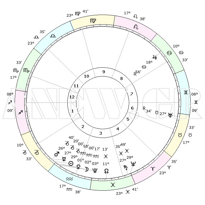| | ΘΕΣΕΙΣ ΠΛΑΝΗΤΩΝ ΑΣΤΡΟΛΟΓΙΚΟΥ ΧΑΡΤΗ ΤΗΣ ΣΤΙΓΜΗΣ ΑΥΤΗΣ | | | | Πλανήτης | Ζώδιο | Μοίρες | Δεκαήμ. | Σε οίκο | Απόκλιση | | Ακμές των οίκων | | Ηλιος | Αιγόκερως | 28°55' | Τρίτο | 3 | 20 S 22 | | 1ος | 16°03' | Σκορπιός | | Σελήνη | Υδροχόος | 01°03' | Πρώτο | 3 | 23 S 03 | | 2ος | 15°37' | Τοξότης | | Ερμής | Αιγόκερως | 27°13' | Τρίτο | 3 | 22 S 39 | | 3ος | 19°14' | Αιγόκερως | | Αφροδίτη | Υδροχόος | 01°53' | Πρώτο | 3 | 20 S 48 | | 4ος | 24°35' | Υδροχόος | | Αρης | Αιγόκερως | 26°36' | Τρίτο | 3 | 21 S 48 | | 5ος | 26°56' | Ιχθείς | | Δίας | Καρκίνος | 18°57'R | Δεύτερο | 8 | 22 N 22 | | 6ος | 23°51' | Κριός | | Κρόνος | Ιχθείς | 27°34' | Τρίτο | 5 | 02 S 59 | | 7ος | 16°03' | Ταύρος | | Ουρανός | Ταύρος | 27°34'R | Τρίτο | 7 | 19 N 25 | | 8ος | 15°37' | Δίδυμοι | | Ποσειδώνας | Ιχθείς | 29°49' | Τρίτο | 5 | 01 S 17 | | 9ος | 19°14' | Καρκίνος | | Πλούτωνας | Υδροχόος | 03°17' | Πρώτο | 3 | 23 S 06 | | 10ος | 24°35' | Λέων | | Β. Δεσμός | Ιχθείς | 11°13' | Δεύτερο | 4 | 07 S 21 | | 11ος | 26°56' | Παρθένος | | Ωροσκόπος | Σκορπιός | 16°03' | Δεύτερο | | | 12ος | 23°51' | Ζυγός | | Μεσουράνημα | Λέων | 24°35' | Τρίτο | | | |