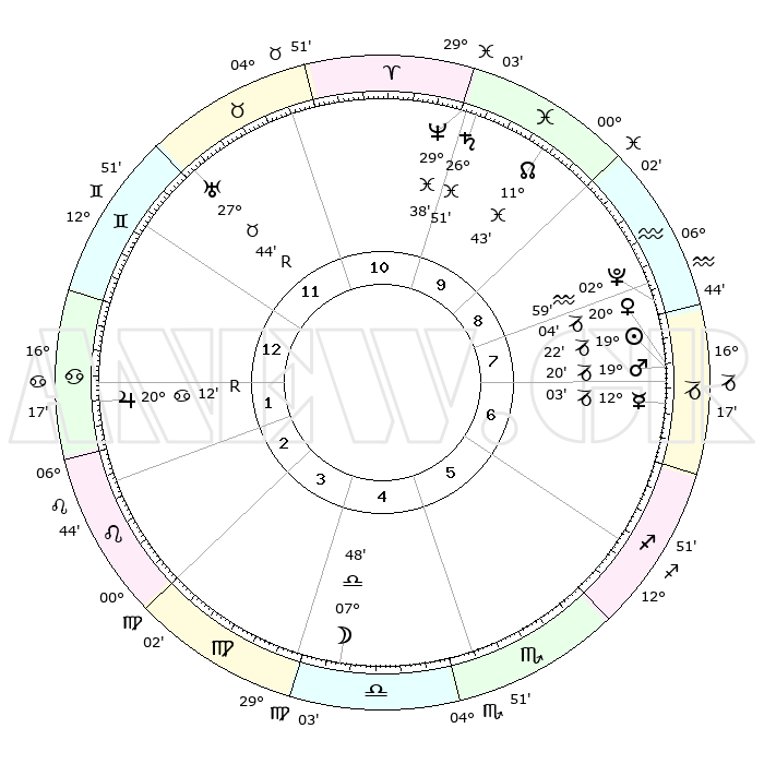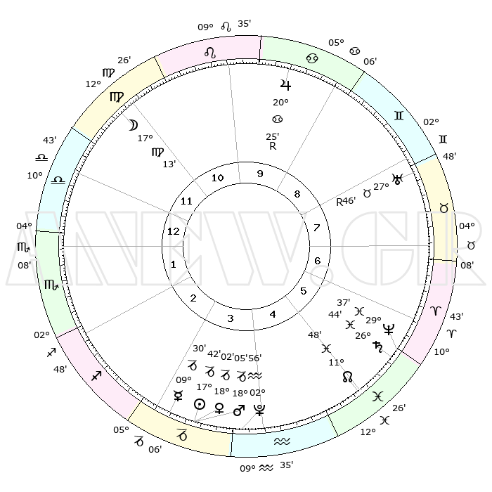 | | ΘΕΣΕΙΣ ΠΛΑΝΗΤΩΝ ΑΣΤΡΟΛΟΓΙΚΟΥ ΧΑΡΤΗ ΤΗΣ ΣΤΙΓΜΗΣ ΑΥΤΗΣ | | | | Πλανήτης | Ζώδιο | Μοίρες | Δεκαήμ. | Σε οίκο | Απόκλιση | | Ακμές των οίκων | | Ηλιος | Αιγόκερως | 18°16' | Δεύτερο | 8 | 22 S 11 | | 1ος | 21°33' | Δίδυμοι | | Σελήνη | Παρθένος | 24°19' | Τρίτο | 4 | 01 N 07 | | 2ος | 13°01' | Καρκίνος | | Ερμής | Αιγόκερως | 10°22' | Δεύτερο | 7 | 24 S 20 | | 3ος | 04°24' | Λέων | | Αφροδίτη | Αιγόκερως | 18°43' | Δεύτερο | 8 | 22 S 54 | | 4ος | 29°27' | Λέων | | Αρης | Αιγόκερως | 18°30' | Δεύτερο | 8 | 23 S 05 | | 5ος | 01°55' | Ζυγός | | Δίας | Καρκίνος | 20°21'R | Τρίτο | 2 | 22 N 09 | | 6ος | 12°14' | Σκορπιός | | Κρόνος | Ιχθείς | 26°46' | Τρίτο | 10 | 03 S 20 | | 7ος | 21°33' | Τοξότης | | Ουρανός | Ταύρος | 27°45'R | Τρίτο | 12 | 19 N 28 | | 8ος | 13°01' | Αιγόκερως | | Ποσειδώνας | Ιχθείς | 29°37' | Τρίτο | 10 | 01 S 22 | | 9ος | 04°24' | Υδροχόος | | Πλούτωνας | Υδροχόος | 02°57' | Πρώτο | 8 | 23 S 10 | | 10ος | 29°27' | Υδροχόος | | Β. Δεσμός | Ιχθείς | 11°46' | Δεύτερο | 10 | 07 S 09 | | 11ος | 01°55' | Κριός | | Ωροσκόπος | Δίδυμοι | 21°33' | Τρίτο | | | 12ος | 12°14' | Ταύρος | | Μεσουράνημα | Υδροχόος | 29°27' | Τρίτο | | | |