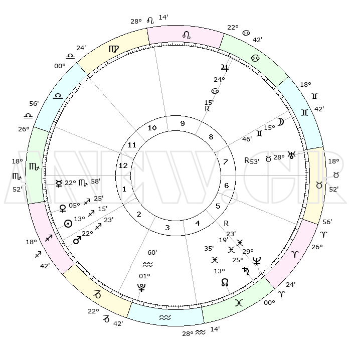 | | ΘΕΣΕΙΣ ΠΛΑΝΗΤΩΝ ΑΣΤΡΟΛΟΓΙΚΟΥ ΧΑΡΤΗ ΤΗΣ ΣΤΙΓΜΗΣ ΑΥΤΗΣ | | | | Πλανήτης | Ζώδιο | Μοίρες | Δεκαήμ. | Σε οίκο | Απόκλιση | | Ακμές των οίκων | | Ηλιος | Τοξότης | 13°13' | Δεύτερο | 2 | 22 S 23 | | 1ος | 10°26' | Σκορπιός | | Σελήνη | Δίδυμοι | 15°19' | Δεύτερο | 8 | 27 N 35 | | 2ος | 09°33' | Τοξότης | | Ερμής | Σκορπιός | 22°57' | Τρίτο | 1 | 16 S 03 | | 3ος | 12°29' | Αιγόκερως | | Αφροδίτη | Τοξότης | 05°23' | Πρώτο | 1 | 20 S 39 | | 4ος | 17°26' | Υδροχόος | | Αρης | Τοξότης | 22°22' | Τρίτο | 2 | 23 S 55 | | 5ος | 20°05' | Ιχθείς | | Δίας | Καρκίνος | 24°15'R | Τρίτο | 9 | 21 N 26 | | 6ος | 17°40' | Κριός | | Κρόνος | Ιχθείς | 25°19' | Τρίτο | 5 | 04 S 01 | | 7ος | 10°26' | Ταύρος | | Ουρανός | Ταύρος | 28°53'R | Τρίτο | 7 | 19 N 42 | | 8ος | 09°33' | Δίδυμοι | | Ποσειδώνας | Ιχθείς | 29°23'R | Τρίτο | 5 | 01 S 29 | | 9ος | 12°29' | Καρκίνος | | Πλούτωνας | Υδροχόος | 01°60' | Πρώτο | 3 | 23 S 23 | | 10ος | 17°26' | Λέων | | Β. Δεσμός | Ιχθείς | 13°36' | Δεύτερο | 4 | 06 S 27 | | 11ος | 20°05' | Παρθένος | | Ωροσκόπος | Σκορπιός | 10°26' | Δεύτερο | | | 12ος | 17°40' | Ζυγός | | Μεσουράνημα | Λέων | 17°26' | Δεύτερο | | | |