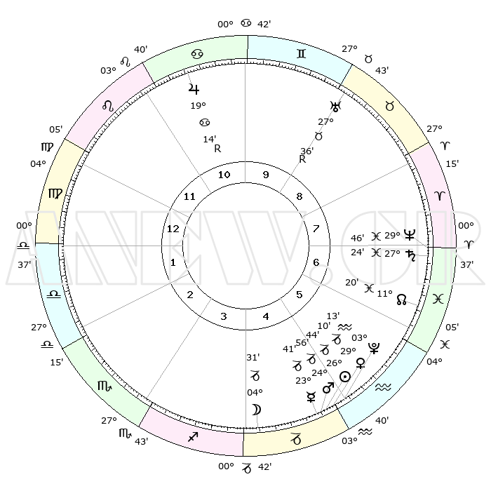 | | ΘΕΣΕΙΣ ΠΛΑΝΗΤΩΝ ΑΣΤΡΟΛΟΓΙΚΟΥ ΧΑΡΤΗ ΤΗΣ ΣΤΙΓΜΗΣ ΑΥΤΗΣ | | | | Πλανήτης | Ζώδιο | Μοίρες | Δεκαήμ. | Σε οίκο | Απόκλιση | | Ακμές των οίκων | | Ηλιος | Αιγόκερως | 26°21' | Τρίτο | 9 | 20 S 53 | | 1ος | 00°32' | Δίδυμοι | | Σελήνη | Τοξότης | 29°51' | Τρίτο | 8 | 28 S 15 | | 2ος | 25°14' | Δίδυμοι | | Ερμής | Αιγόκερως | 23°03' | Τρίτο | 9 | 23 S 18 | | 3ος | 16°38' | Καρκίνος | | Αφροδίτη | Αιγόκερως | 28°41' | Τρίτο | 9 | 21 S 25 | | 4ος | 09°26' | Λέων | | Αρης | Αιγόκερως | 24°38' | Τρίτο | 9 | 22 S 09 | | 5ος | 07°60' | Παρθένος | | Δίας | Καρκίνος | 19°17'R | Δεύτερο | 3 | 22 N 19 | | 6ος | 16°32' | Ζυγός | | Κρόνος | Ιχθείς | 27°22' | Τρίτο | 11 | 03 S 05 | | 7ος | 00°32' | Τοξότης | | Ουρανός | Ταύρος | 27°36'R | Τρίτο | 12 | 19 N 26 | | 8ος | 25°14' | Τοξότης | | Ποσειδώνας | Ιχθείς | 29°46' | Τρίτο | 11 | 01 S 18 | | 9ος | 16°38' | Αιγόκερως | | Πλούτωνας | Υδροχόος | 03°12' | Πρώτο | 9 | 23 S 07 | | 10ος | 09°26' | Υδροχόος | | Β. Δεσμός | Ιχθείς | 11°21' | Δεύτερο | 11 | 07 S 18 | | 11ος | 07°60' | Ιχθείς | | Ωροσκόπος | Δίδυμοι | 00°32' | Πρώτο | | | 12ος | 16°32' | Κριός | | Μεσουράνημα | Υδροχόος | 09°26' | Πρώτο | | | |