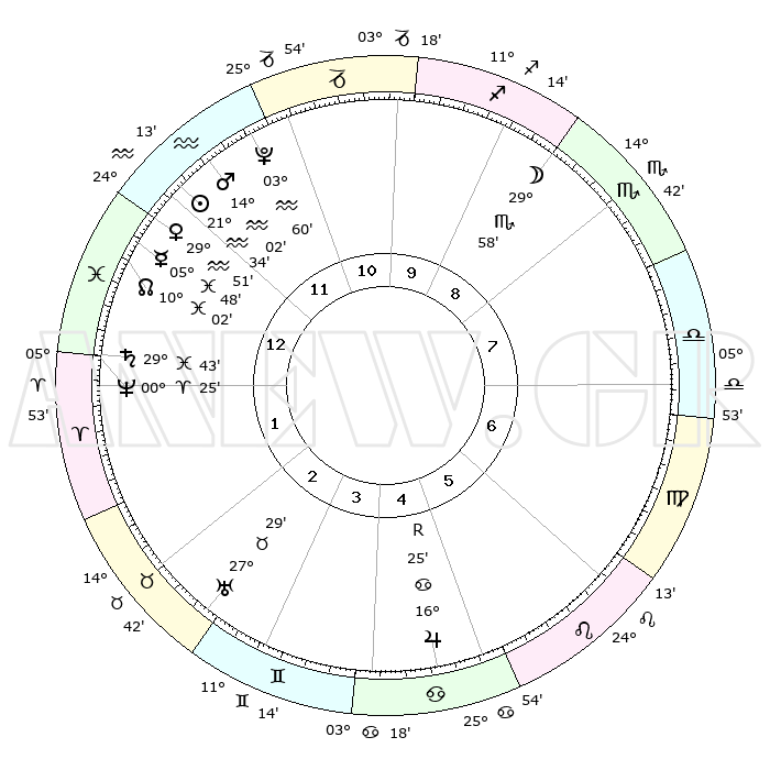 | | ΘΕΣΕΙΣ ΠΛΑΝΗΤΩΝ ΑΣΤΡΟΛΟΓΙΚΟΥ ΧΑΡΤΗ ΤΗΣ ΣΤΙΓΜΗΣ ΑΥΤΗΣ | | | | Πλανήτης | Ζώδιο | Μοίρες | Δεκαήμ. | Σε οίκο | Απόκλιση | | Ακμές των οίκων | | Ηλιος | Υδροχόος | 21°46' | Τρίτο | 9 | 14 S 15 | | 1ος | 04°60' | Καρκίνος | | Σελήνη | Τοξότης | 02°21' | Πρώτο | 6 | 25 S 44 | | 2ος | 25°33' | Καρκίνος | | Ερμής | Ιχθείς | 06°09' | Πρώτο | 9 | 10 S 01 | | 3ος | 17°43' | Λέων | | Αφροδίτη | Ιχθείς | 00°06' | Πρώτο | 9 | 12 S 48 | | 4ος | 14°51' | Παρθένος | | Αρης | Υδροχόος | 14°11' | Δεύτερο | 8 | 17 S 35 | | 5ος | 19°31' | Ζυγός | | Δίας | Καρκίνος | 16°24'R | Δεύτερο | 1 | 22 N 45 | | 6ος | 29°05' | Σκορπιός | | Κρόνος | Ιχθείς | 29°44' | Τρίτο | 10 | 02 S 05 | | 7ος | 04°60' | Αιγόκερως | | Ουρανός | Ταύρος | 27°29' | Τρίτο | 11 | 19 N 25 | | 8ος | 25°33' | Αιγόκερως | | Ποσειδώνας | Κριός | 00°25' | Πρώτο | 10 | 01 S 02 | | 9ος | 17°43' | Υδροχόος | | Πλούτωνας | Υδροχόος | 03°60' | Πρώτο | 8 | 22 S 58 | | 10ος | 14°51' | Ιχθείς | | Β. Δεσμός | Ιχθείς | 10°01' | Δεύτερο | 9 | 07 S 48 | | 11ος | 19°31' | Κριός | | Ωροσκόπος | Καρκίνος | 04°60' | Πρώτο | | | 12ος | 29°05' | Ταύρος | | Μεσουράνημα | Ιχθείς | 14°51' | Δεύτερο | | | |