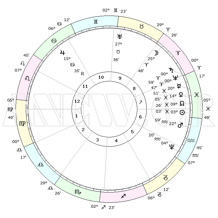 | | ΘΕΣΕΙΣ ΠΛΑΝΗΤΩΝ ΑΣΤΡΟΛΟΓΙΚΟΥ ΧΑΡΤΗ ΤΗΣ ΣΤΙΓΜΗΣ ΑΥΤΗΣ | | | | Πλανήτης | Ζώδιο | Μοίρες | Δεκαήμ. | Σε οίκο | Απόκλιση | | Ακμές των οίκων | | Ηλιος | Ιχθείς | 02°58' | Πρώτο | 7 | 10 S 25 | | 1ος | 13°14' | Λέων | | Σελήνη | Κριός | 24°43' | Τρίτο | 9 | 13 N 06 | | 2ος | 05°22' | Παρθένος | | Ερμής | Ιχθείς | 20°48' | Τρίτο | 8 | 02 S 07 | | 3ος | 02°11' | Ζυγός | | Αφροδίτη | Ιχθείς | 13°60' | Δεύτερο | 8 | 07 S 38 | | 4ος | 04°30' | Σκορπιός | | Αρης | Υδροχόος | 22°56' | Τρίτο | 7 | 14 S 54 | | 5ος | 09°54' | Τοξότης | | Δίας | Καρκίνος | 15°35'R | Δεύτερο | 12 | 22 N 51 | | 6ος | 13°36' | Αιγόκερως | | Κρόνος | Κριός | 00°58' | Πρώτο | 8 | 01 S 35 | | 7ος | 13°14' | Υδροχόος | | Ουρανός | Ταύρος | 27°36' | Τρίτο | 10 | 19 N 26 | | 8ος | 05°22' | Ιχθείς | | Ποσειδώνας | Κριός | 00°47' | Πρώτο | 8 | 00 S 53 | | 9ος | 02°11' | Κριός | | Πλούτωνας | Υδροχόος | 04°20' | Πρώτο | 6 | 22 S 54 | | 10ος | 04°30' | Ταύρος | | Β. Δεσμός | Ιχθείς | 09°26' | Πρώτο | 8 | 08 S 02 | | 11ος | 09°54' | Δίδυμοι | | Ωροσκόπος | Λέων | 13°14' | Δεύτερο | | | 12ος | 13°36' | Καρκίνος | | Μεσουράνημα | Ταύρος | 04°30' | Πρώτο | | | |