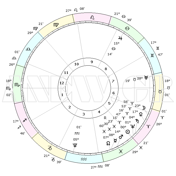 | | ΘΕΣΕΙΣ ΠΛΑΝΗΤΩΝ ΑΣΤΡΟΛΟΓΙΚΟΥ ΧΑΡΤΗ ΤΗΣ ΣΤΙΓΜΗΣ ΑΥΤΗΣ | | | | Πλανήτης | Ζώδιο | Μοίρες | Δεκαήμ. | Σε οίκο | Απόκλιση | | Ακμές των οίκων | | Ηλιος | Κριός | 00°10' | Πρώτο | 5 | 00 N 04 | | 1ος | 27°05' | Ζυγός | | Σελήνη | Κριός | 22°54' | Τρίτο | 6 | 12 N 17 | | 2ος | 25°19' | Σκορπιός | | Ερμής | Ιχθείς | 08°30'R | Πρώτο | 5 | 07 S 28 | | 3ος | 27°03' | Τοξότης | | Αφροδίτη | Κριός | 17°48' | Δεύτερο | 6 | 06 N 11 | | 4ος | 01°03' | Υδροχόος | | Αρης | Ιχθείς | 14°20' | Δεύτερο | 5 | 07 S 10 | | 5ος | 03°60' | Ιχθείς | | Δίας | Καρκίνος | 15°14' | Δεύτερο | 9 | 22 N 55 | | 6ος | 02°55' | Κριός | | Κρόνος | Κριός | 04°16' | Πρώτο | 6 | 00 S 15 | | 7ος | 27°05' | Κριός | | Ουρανός | Ταύρος | 28°19' | Τρίτο | 8 | 19 N 37 | | 8ος | 25°19' | Ταύρος | | Ποσειδώνας | Κριός | 01°47' | Πρώτο | 5 | 00 S 29 | | 9ος | 27°03' | Δίδυμοι | | Πλούτωνας | Υδροχόος | 05°01' | Πρώτο | 4 | 22 S 49 | | 10ος | 01°03' | Λέων | | Β. Δεσμός | Ιχθείς | 07°60' | Πρώτο | 5 | 08 S 34 | | 11ος | 03°60' | Παρθένος | | Ωροσκόπος | Ζυγός | 27°05' | Τρίτο | | | 12ος | 02°55' | Ζυγός | | Μεσουράνημα | Λέων | 01°03' | Πρώτο | | | |