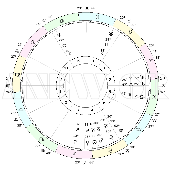 | | ΘΕΣΕΙΣ ΠΛΑΝΗΤΩΝ ΑΣΤΡΟΛΟΓΙΚΟΥ ΧΑΡΤΗ ΤΗΣ ΣΤΙΓΜΗΣ ΑΥΤΗΣ | | | | Πλανήτης | Ζώδιο | Μοίρες | Δεκαήμ. | Σε οίκο | Απόκλιση | | Ακμές των οίκων | | Ηλιος | Αιγόκερως | 00°13' | Πρώτο | 4 | 23 S 26 | | 1ος | 04°15' | Παρθένος | | Σελήνη | Αιγόκερως | 19°57' | Δεύτερο | 5 | 25 S 51 | | 2ος | 28°32' | Παρθένος | | Ερμής | Τοξότης | 13°31' | Δεύτερο | 4 | 21 S 46 | | 3ος | 27°34' | Ζυγός | | Αφροδίτη | Τοξότης | 26°26' | Τρίτο | 4 | 23 S 30 | | 4ος | 00°31' | Τοξότης | | Αρης | Αιγόκερως | 04°57' | Πρώτο | 5 | 24 S 10 | | 5ος | 04°26' | Αιγόκερως | | Δίας | Καρκίνος | 22°37'R | Τρίτο | 11 | 21 N 45 | | 6ος | 06°05' | Υδροχόος | | Κρόνος | Ιχθείς | 25°47' | Τρίτο | 7 | 03 S 47 | | 7ος | 04°15' | Ιχθείς | | Ουρανός | Ταύρος | 28°15'R | Τρίτο | 9 | 19 N 34 | | 8ος | 28°32' | Ιχθείς | | Ποσειδώνας | Ιχθείς | 29°25' | Τρίτο | 8 | 01 S 28 | | 9ος | 27°34' | Κριός | | Πλούτωνας | Υδροχόος | 02°26' | Πρώτο | 5 | 23 S 17 | | 10ος | 00°31' | Δίδυμοι | | Β. Δεσμός | Ιχθείς | 12°42' | Δεύτερο | 7 | 06 S 47 | | 11ος | 04°26' | Καρκίνος | | Ωροσκόπος | Παρθένος | 04°15' | Πρώτο | | | 12ος | 06°05' | Λέων | | Μεσουράνημα | Δίδυμοι | 00°31' | Πρώτο | | | |