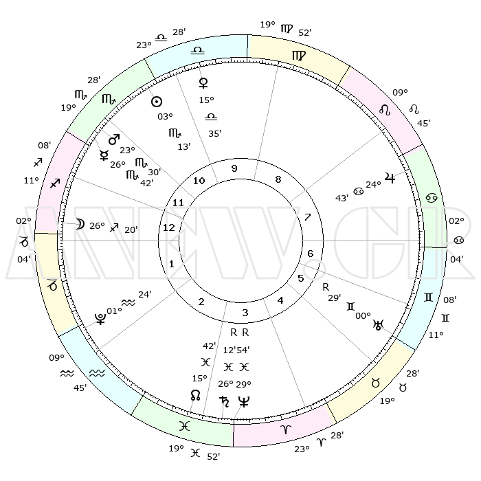 | | ΘΕΣΕΙΣ ΠΛΑΝΗΤΩΝ ΑΣΤΡΟΛΟΓΙΚΟΥ ΧΑΡΤΗ ΤΗΣ ΣΤΙΓΜΗΣ ΑΥΤΗΣ | | | | Πλανήτης | Ζώδιο | Μοίρες | Δεκαήμ. | Σε οίκο | Απόκλιση | | Ακμές των οίκων | | Ηλιος | Σκορπιός | 03°08' | Πρώτο | 11 | 12 S 33 | | 1ος | 03°48' | Τοξότης | | Σελήνη | Τοξότης | 25°15' | Τρίτο | 1 | 28 S 25 | | 2ος | 05°29' | Αιγόκερως | | Ερμής | Σκορπιός | 26°35' | Τρίτο | 12 | 22 S 01 | | 3ος | 11°49' | Υδροχόος | | Αφροδίτη | Ζυγός | 15°28' | Δεύτερο | 10 | 04 S 41 | | 4ος | 17°55' | Ιχθείς | | Αρης | Σκορπιός | 23°26' | Τρίτο | 12 | 18 S 57 | | 5ος | 18°27' | Κριός | | Δίας | Καρκίνος | 24°43' | Τρίτο | 8 | 21 N 15 | | 6ος | 12°59' | Ταύρος | | Κρόνος | Ιχθείς | 26°12'R | Τρίτο | 4 | 03 S 47 | | 7ος | 03°48' | Δίδυμοι | | Ουρανός | Δίδυμοι | 00°29'R | Πρώτο | 6 | 20 N 02 | | 8ος | 05°29' | Καρκίνος | | Ποσειδώνας | Ιχθείς | 29°54'R | Τρίτο | 4 | 01 S 18 | | 9ος | 11°49' | Λέων | | Πλούτωνας | Υδροχόος | 01°24' | Πρώτο | 2 | 23 S 31 | | 10ος | 17°55' | Παρθένος | | Β. Δεσμός | Ιχθείς | 15°42' | Δεύτερο | 3 | 05 S 38 | | 11ος | 18°27' | Ζυγός | | Ωροσκόπος | Τοξότης | 03°48' | Πρώτο | | | 12ος | 12°59' | Σκορπιός | | Μεσουράνημα | Παρθένος | 17°55' | Δεύτερο | | | |