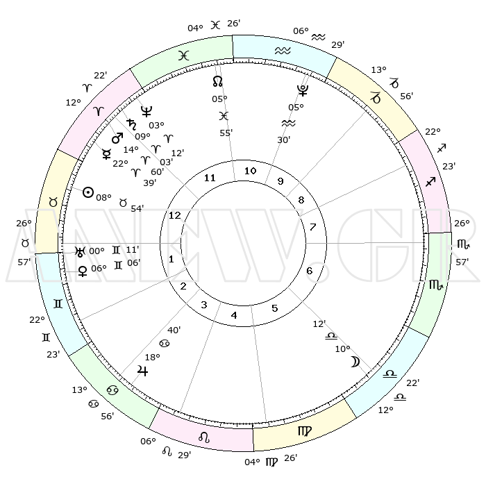 | | ΘΕΣΕΙΣ ΠΛΑΝΗΤΩΝ ΑΣΤΡΟΛΟΓΙΚΟΥ ΧΑΡΤΗ ΤΗΣ ΣΤΙΓΜΗΣ ΑΥΤΗΣ | | | | Πλανήτης | Ζώδιο | Μοίρες | Δεκαήμ. | Σε οίκο | Απόκλιση | | Ακμές των οίκων | | Ηλιος | Ταύρος | 08°47' | Πρώτο | 1 | 14 N 26 | | 1ος | 02°04' | Κριός | | Σελήνη | Ζυγός | 08°53' | Πρώτο | 7 | 05 S 58 | | 2ος | 11°51' | Ταύρος | | Ερμής | Κριός | 22°28' | Τρίτο | 1 | 06 N 46 | | 3ος | 08°56' | Δίδυμοι | | Αφροδίτη | Δίδυμοι | 05°59' | Πρώτο | 2 | 22 N 06 | | 4ος | 01°09' | Καρκίνος | | Αρης | Κριός | 14°55' | Δεύτερο | 1 | 05 N 03 | | 5ος | 23°33' | Καρκίνος | | Δίας | Καρκίνος | 18°39' | Δεύτερο | 4 | 22 N 31 | | 6ος | 21°17' | Λέων | | Κρόνος | Κριός | 09°03' | Πρώτο | 1 | 01 N 35 | | 7ος | 02°04' | Ζυγός | | Ουρανός | Δίδυμοι | 00°10' | Πρώτο | 2 | 20 N 01 | | 8ος | 11°51' | Σκορπιός | | Ποσειδώνας | Κριός | 03°12' | Πρώτο | 1 | 00 N 04 | | 9ος | 08°56' | Τοξότης | | Πλούτωνας | Υδροχόος | 05°30' | Πρώτο | 11 | 22 S 49 | | 10ος | 01°09' | Αιγόκερως | | Β. Δεσμός | Ιχθείς | 05°55' | Πρώτο | 12 | 09 S 20 | | 11ος | 23°33' | Αιγόκερως | | Ωροσκόπος | Κριός | 02°04' | Πρώτο | | | 12ος | 21°17' | Υδροχόος | | Μεσουράνημα | Αιγόκερως | 01°09' | Πρώτο | | | |
