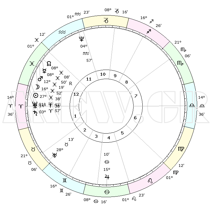 | | ΘΕΣΕΙΣ ΠΛΑΝΗΤΩΝ ΑΣΤΡΟΛΟΓΙΚΟΥ ΧΑΡΤΗ ΤΗΣ ΣΤΙΓΜΗΣ ΑΥΤΗΣ | | | | Πλανήτης | Ζώδιο | Μοίρες | Δεκαήμ. | Σε οίκο | Απόκλιση | | Ακμές των οίκων | | Ηλιος | Ιχθείς | 27°33' | Τρίτο | 1 | 00 S 58 | | 1ος | 03°33' | Ιχθείς | | Σελήνη | Ιχθείς | 15°54' | Δεύτερο | 1 | 04 S 58 | | 2ος | 18°39' | Κριός | | Ερμής | Ιχθείς | 08°51'R | Πρώτο | 1 | 06 S 43 | | 3ος | 20°40' | Ταύρος | | Αφροδίτη | Κριός | 14°32' | Δεύτερο | 1 | 04 N 51 | | 4ος | 14°44' | Δίδυμοι | | Αρης | Ιχθείς | 12°16' | Δεύτερο | 1 | 07 S 58 | | 5ος | 06°25' | Καρκίνος | | Δίας | Καρκίνος | 15°10' | Δεύτερο | 5 | 22 N 56 | | 6ος | 00°21' | Λέων | | Κρόνος | Κριός | 03°56' | Πρώτο | 1 | 00 S 23 | | 7ος | 03°33' | Παρθένος | | Ουρανός | Ταύρος | 28°13' | Τρίτο | 3 | 19 N 35 | | 8ος | 18°39' | Ζυγός | | Ποσειδώνας | Κριός | 01°41' | Πρώτο | 1 | 00 S 32 | | 9ος | 20°40' | Σκορπιός | | Πλούτωνας | Υδροχόος | 04°57' | Πρώτο | 12 | 22 S 49 | | 10ος | 14°44' | Τοξότης | | Β. Δεσμός | Ιχθείς | 08°08' | Πρώτο | 1 | 08 S 31 | | 11ος | 06°25' | Αιγόκερως | | Ωροσκόπος | Ιχθείς | 03°33' | Πρώτο | | | 12ος | 00°21' | Υδροχόος | | Μεσουράνημα | Τοξότης | 14°44' | Δεύτερο | | | |