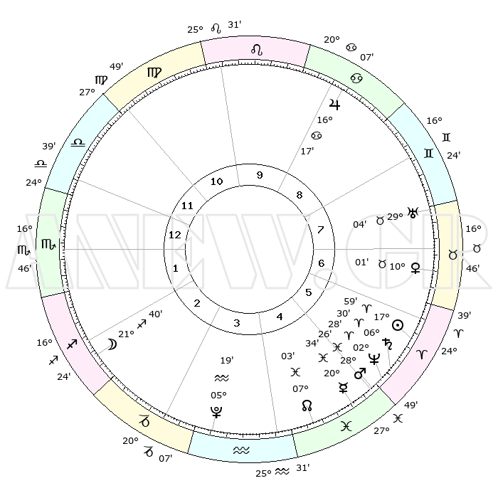 | | ΘΕΣΕΙΣ ΠΛΑΝΗΤΩΝ ΑΣΤΡΟΛΟΓΙΚΟΥ ΧΑΡΤΗ ΤΗΣ ΣΤΙΓΜΗΣ ΑΥΤΗΣ | | | | Πλανήτης | Ζώδιο | Μοίρες | Δεκαήμ. | Σε οίκο | Απόκλιση | | Ακμές των οίκων | | Ηλιος | Κριός | 17°55' | Δεύτερο | 6 | 07 N 02 | | 1ος | 28°03' | Ζυγός | | Σελήνη | Τοξότης | 20°54' | Τρίτο | 2 | 28 S 09 | | 2ος | 26°20' | Σκορπιός | | Ερμής | Ιχθείς | 20°30' | Τρίτο | 5 | 05 S 44 | | 3ος | 28°09' | Τοξότης | | Αφροδίτη | Ταύρος | 09°56' | Πρώτο | 7 | 14 N 38 | | 4ος | 02°12' | Υδροχόος | | Αρης | Ιχθείς | 28°23' | Τρίτο | 5 | 01 S 35 | | 5ος | 05°08' | Ιχθείς | | Δίας | Καρκίνος | 16°17' | Δεύτερο | 9 | 22 N 49 | | 6ος | 03°59' | Κριός | | Κρόνος | Κριός | 06°30' | Πρώτο | 6 | 00 N 37 | | 7ος | 28°03' | Κριός | | Ουρανός | Ταύρος | 29°04' | Τρίτο | 8 | 19 N 47 | | 8ος | 26°20' | Ταύρος | | Ποσειδώνας | Κριός | 02°28' | Πρώτο | 5 | 00 S 13 | | 9ος | 28°09' | Δίδυμοι | | Πλούτωνας | Υδροχόος | 05°19' | Πρώτο | 4 | 22 S 47 | | 10ος | 02°12' | Λέων | | Β. Δεσμός | Ιχθείς | 07°03' | Πρώτο | 5 | 08 S 55 | | 11ος | 05°08' | Παρθένος | | Ωροσκόπος | Ζυγός | 28°03' | Τρίτο | | | 12ος | 03°59' | Ζυγός | | Μεσουράνημα | Λέων | 02°12' | Πρώτο | | | |