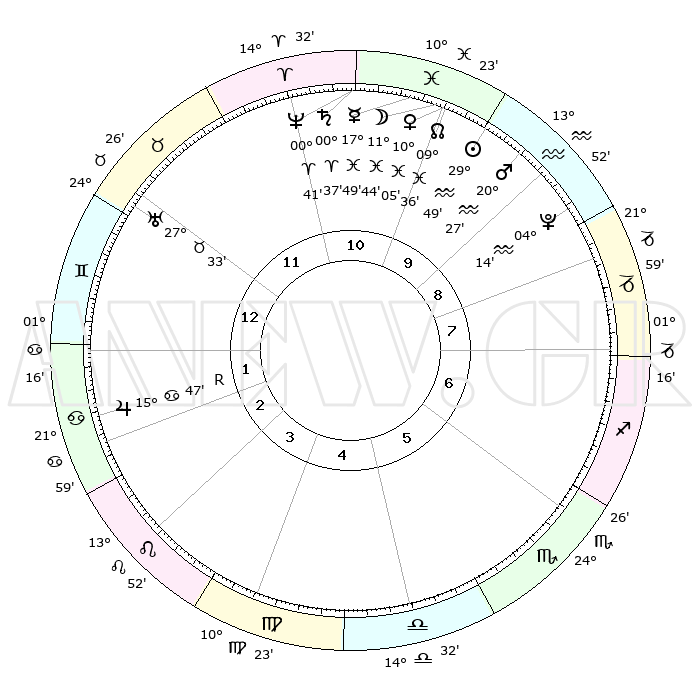 | | ΘΕΣΕΙΣ ΠΛΑΝΗΤΩΝ ΑΣΤΡΟΛΟΓΙΚΟΥ ΧΑΡΤΗ ΤΗΣ ΣΤΙΓΜΗΣ ΑΥΤΗΣ | | | | Πλανήτης | Ζώδιο | Μοίρες | Δεκαήμ. | Σε οίκο | Απόκλιση | | Ακμές των οίκων | | Ηλιος | Υδροχόος | 29°44' | Τρίτο | 10 | 11 S 34 | | 1ος | 00°28' | Δίδυμοι | | Σελήνη | Ιχθείς | 10°37' | Δεύτερο | 11 | 07 S 26 | | 2ος | 25°11' | Δίδυμοι | | Ερμής | Ιχθείς | 17°44' | Δεύτερο | 11 | 04 S 04 | | 3ος | 16°35' | Καρκίνος | | Αφροδίτη | Ιχθείς | 09°58' | Πρώτο | 11 | 09 S 11 | | 4ος | 09°23' | Λέων | | Αρης | Υδροχόος | 20°24' | Τρίτο | 10 | 15 S 43 | | 5ος | 07°55' | Παρθένος | | Δίας | Καρκίνος | 15°47'R | Δεύτερο | 2 | 22 N 50 | | 6ος | 16°26' | Ζυγός | | Κρόνος | Κριός | 00°36' | Πρώτο | 11 | 01 S 44 | | 7ος | 00°28' | Τοξότης | | Ουρανός | Ταύρος | 27°33' | Τρίτο | 12 | 19 N 26 | | 8ος | 25°11' | Τοξότης | | Ποσειδώνας | Κριός | 00°41' | Πρώτο | 11 | 00 S 56 | | 9ος | 16°35' | Αιγόκερως | | Πλούτωνας | Υδροχόος | 04°14' | Πρώτο | 9 | 22 S 55 | | 10ος | 09°23' | Υδροχόος | | Β. Δεσμός | Ιχθείς | 09°36' | Πρώτο | 11 | 07 S 58 | | 11ος | 07°55' | Ιχθείς | | Ωροσκόπος | Δίδυμοι | 00°28' | Πρώτο | | | 12ος | 16°26' | Κριός | | Μεσουράνημα | Υδροχόος | 09°23' | Πρώτο | | | |