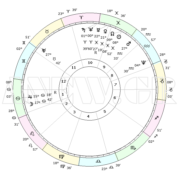 | | ΘΕΣΕΙΣ ΠΛΑΝΗΤΩΝ ΑΣΤΡΟΛΟΓΙΚΟΥ ΧΑΡΤΗ ΤΗΣ ΣΤΙΓΜΗΣ ΑΥΤΗΣ | | | | Πλανήτης | Ζώδιο | Μοίρες | Δεκαήμ. | Σε οίκο | Απόκλιση | | Ακμές των οίκων | | Ηλιος | Ιχθείς | 08°48' | Πρώτο | 10 | 08 S 16 | | 1ος | 14°07' | Δίδυμοι | | Σελήνη | Καρκίνος | 16°43' | Δεύτερο | 2 | 26 N 32 | | 2ος | 06°30' | Καρκίνος | | Ερμής | Ιχθείς | 22°28'R | Τρίτο | 10 | 00 S 13 | | 3ος | 27°43' | Καρκίνος | | Αφροδίτη | Ιχθείς | 21°14' | Τρίτο | 10 | 04 S 45 | | 4ος | 21°50' | Λέων | | Αρης | Υδροχόος | 27°29' | Τρίτο | 10 | 13 S 22 | | 5ος | 22°53' | Παρθένος | | Δίας | Καρκίνος | 15°19'R | Δεύτερο | 2 | 22 N 54 | | 6ος | 02°57' | Σκορπιός | | Κρόνος | Κριός | 01°39' | Πρώτο | 11 | 01 S 18 | | 7ος | 14°07' | Τοξότης | | Ουρανός | Ταύρος | 27°42' | Τρίτο | 12 | 19 N 28 | | 8ος | 06°30' | Αιγόκερως | | Ποσειδώνας | Κριός | 00°60' | Πρώτο | 11 | 00 S 48 | | 9ος | 27°43' | Αιγόκερως | | Πλούτωνας | Υδροχόος | 04°30' | Πρώτο | 9 | 22 S 53 | | 10ος | 21°50' | Υδροχόος | | Β. Δεσμός | Ιχθείς | 09°08' | Πρώτο | 10 | 08 S 09 | | 11ος | 22°53' | Ιχθείς | | Ωροσκόπος | Δίδυμοι | 14°07' | Δεύτερο | | | 12ος | 02°57' | Ταύρος | | Μεσουράνημα | Υδροχόος | 21°50' | Τρίτο | | | |
