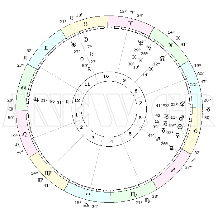 | | ΘΕΣΕΙΣ ΠΛΑΝΗΤΩΝ ΑΣΤΡΟΛΟΓΙΚΟΥ ΧΑΡΤΗ ΤΗΣ ΣΤΙΓΜΗΣ ΑΥΤΗΣ | | | | Πλανήτης | Ζώδιο | Μοίρες | Δεκαήμ. | Σε οίκο | Απόκλιση | | Ακμές των οίκων | | Ηλιος | Αιγόκερως | 09°10' | Πρώτο | 7 | 23 S 07 | | 1ος | 06°31' | Καρκίνος | | Σελήνη | Ταύρος | 16°19' | Δεύτερο | 11 | 21 N 07 | | 2ος | 27°01' | Καρκίνος | | Ερμής | Τοξότης | 26°34' | Τρίτο | 6 | 23 S 48 | | 3ος | 19°19' | Λέων | | Αφροδίτη | Αιγόκερως | 07°29' | Πρώτο | 7 | 23 S 40 | | 4ος | 16°42' | Παρθένος | | Αρης | Αιγόκερως | 11°39' | Δεύτερο | 7 | 23 S 48 | | 5ος | 21°35' | Ζυγός | | Δίας | Καρκίνος | 21°32'R | Τρίτο | 1 | 21 N 57 | | 6ος | 00°58' | Τοξότης | | Κρόνος | Ιχθείς | 26°12' | Τρίτο | 10 | 03 S 35 | | 7ος | 06°31' | Αιγόκερως | | Ουρανός | Ταύρος | 27°59'R | Τρίτο | 11 | 19 N 31 | | 8ος | 27°01' | Αιγόκερως | | Ποσειδώνας | Ιχθείς | 29°30' | Τρίτο | 10 | 01 S 26 | | 9ος | 19°19' | Υδροχόος | | Πλούτωνας | Υδροχόος | 02°41' | Πρώτο | 8 | 23 S 14 | | 10ος | 16°42' | Ιχθείς | | Β. Δεσμός | Ιχθείς | 12°15' | Δεύτερο | 9 | 06 S 58 | | 11ος | 21°35' | Κριός | | Ωροσκόπος | Καρκίνος | 06°31' | Πρώτο | | | 12ος | 00°58' | Δίδυμοι | | Μεσουράνημα | Ιχθείς | 16°42' | Δεύτερο | | | |
