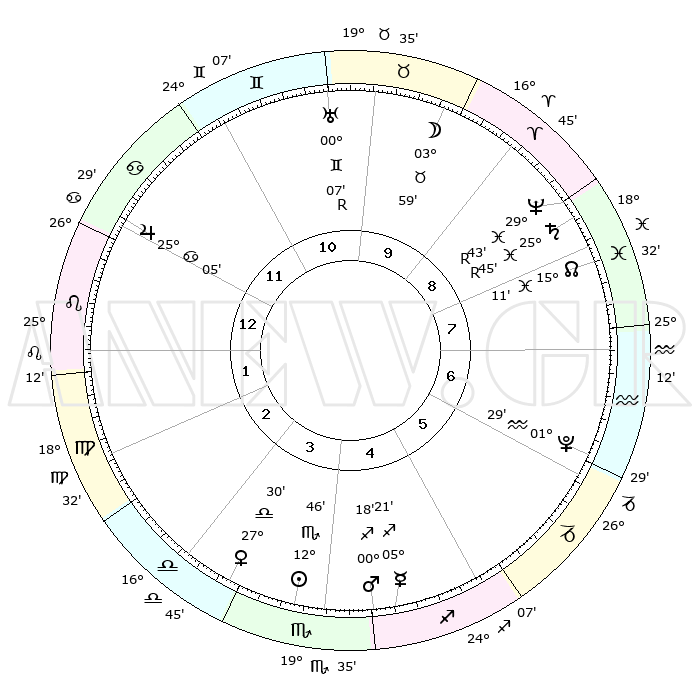 | | ΘΕΣΕΙΣ ΠΛΑΝΗΤΩΝ ΑΣΤΡΟΛΟΓΙΚΟΥ ΧΑΡΤΗ ΤΗΣ ΣΤΙΓΜΗΣ ΑΥΤΗΣ | | | | Πλανήτης | Ζώδιο | Μοίρες | Δεκαήμ. | Σε οίκο | Απόκλιση | | Ακμές των οίκων | | Ηλιος | Σκορπιός | 12°39' | Δεύτερο | 5 | 15 S 38 | | 1ος | 21°24' | Καρκίνος | | Σελήνη | Ταύρος | 02°14' | Πρώτο | 10 | 15 N 38 | | 2ος | 11°59' | Λέων | | Ερμής | Τοξότης | 05°17' | Πρώτο | 5 | 23 S 57 | | 3ος | 05°54' | Παρθένος | | Αφροδίτη | Ζυγός | 27°22' | Τρίτο | 4 | 09 S 12 | | 4ος | 05°44' | Ζυγός | | Αρης | Τοξότης | 00°13' | Πρώτο | 5 | 20 S 37 | | 5ος | 11°46' | Σκορπιός | | Δίας | Καρκίνος | 25°04' | Τρίτο | 1 | 21 N 12 | | 6ος | 18°56' | Τοξότης | | Κρόνος | Ιχθείς | 25°46'R | Τρίτο | 9 | 03 S 56 | | 7ος | 21°24' | Αιγόκερως | | Ουρανός | Δίδυμοι | 00°07'R | Πρώτο | 11 | 19 N 58 | | 8ος | 11°59' | Υδροχόος | | Ποσειδώνας | Ιχθείς | 29°43'R | Τρίτο | 9 | 01 S 22 | | 9ος | 05°54' | Ιχθείς | | Πλούτωνας | Υδροχόος | 01°29' | Πρώτο | 7 | 23 S 30 | | 10ος | 05°44' | Κριός | | Β. Δεσμός | Ιχθείς | 15°12' | Δεύτερο | 9 | 05 S 50 | | 11ος | 11°46' | Ταύρος | | Ωροσκόπος | Καρκίνος | 21°24' | Τρίτο | | | 12ος | 18°56' | Δίδυμοι | | Μεσουράνημα | Κριός | 05°44' | Πρώτο | | | |