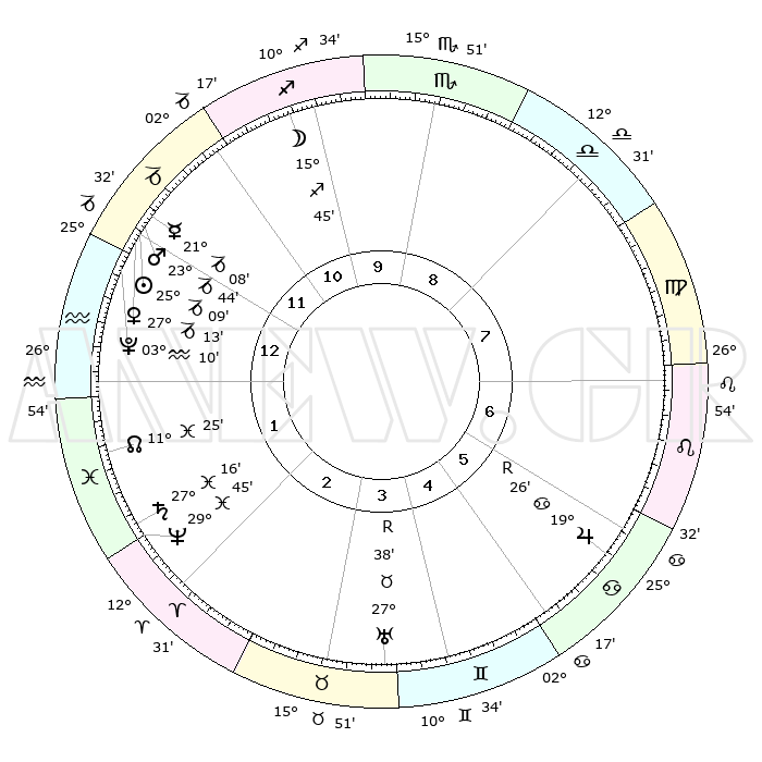 | | ΘΕΣΕΙΣ ΠΛΑΝΗΤΩΝ ΑΣΤΡΟΛΟΓΙΚΟΥ ΧΑΡΤΗ ΤΗΣ ΣΤΙΓΜΗΣ ΑΥΤΗΣ | | | | Πλανήτης | Ζώδιο | Μοίρες | Δεκαήμ. | Σε οίκο | Απόκλιση | | Ακμές των οίκων | | Ηλιος | Αιγόκερως | 25°05' | Τρίτο | 1 | 21 S 07 | | 1ος | 24°37' | Αιγόκερως | | Σελήνη | Τοξότης | 14°56' | Δεύτερο | 11 | 27 S 39 | | 2ος | 07°44' | Ιχθείς | | Ερμής | Αιγόκερως | 21°02' | Τρίτο | 12 | 23 S 34 | | 3ος | 16°57' | Κριός | | Αφροδίτη | Αιγόκερως | 27°08' | Τρίτο | 1 | 21 S 42 | | 4ος | 16°22' | Ταύρος | | Αρης | Αιγόκερως | 23°41' | Τρίτο | 12 | 22 S 19 | | 5ος | 09°34' | Δίδυμοι | | Δίας | Καρκίνος | 19°27'R | Δεύτερο | 6 | 22 N 18 | | 6ος | 00°50' | Καρκίνος | | Κρόνος | Ιχθείς | 27°16' | Τρίτο | 2 | 03 S 07 | | 7ος | 24°37' | Καρκίνος | | Ουρανός | Ταύρος | 27°38'R | Τρίτο | 4 | 19 N 26 | | 8ος | 07°44' | Παρθένος | | Ποσειδώνας | Ιχθείς | 29°44' | Τρίτο | 2 | 01 S 19 | | 9ος | 16°57' | Ζυγός | | Πλούτωνας | Υδροχόος | 03°10' | Πρώτο | 1 | 23 S 08 | | 10ος | 16°22' | Σκορπιός | | Β. Δεσμός | Ιχθείς | 11°25' | Δεύτερο | 2 | 07 S 17 | | 11ος | 09°34' | Τοξότης | | Ωροσκόπος | Αιγόκερως | 24°37' | Τρίτο | | | 12ος | 00°50' | Αιγόκερως | | Μεσουράνημα | Σκορπιός | 16°22' | Δεύτερο | | | |