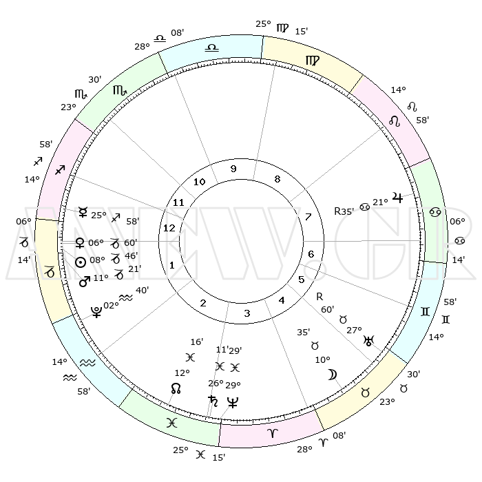 | | ΘΕΣΕΙΣ ΠΛΑΝΗΤΩΝ ΑΣΤΡΟΛΟΓΙΚΟΥ ΧΑΡΤΗ ΤΗΣ ΣΤΙΓΜΗΣ ΑΥΤΗΣ | | | | Πλανήτης | Ζώδιο | Μοίρες | Δεκαήμ. | Σε οίκο | Απόκλιση | | Ακμές των οίκων | | Ηλιος | Αιγόκερως | 08°42' | Πρώτο | 1 | 23 S 09 | | 1ος | 13°27' | Τοξότης | | Σελήνη | Ταύρος | 09°33' | Πρώτο | 5 | 18 N 46 | | 2ος | 16°50' | Αιγόκερως | | Ερμής | Τοξότης | 25°52' | Τρίτο | 1 | 23 S 44 | | 3ος | 24°47' | Υδροχόος | | Αφροδίτη | Αιγόκερως | 06°54' | Πρώτο | 1 | 23 S 41 | | 4ος | 00°37' | Κριός | | Αρης | Αιγόκερως | 11°17' | Δεύτερο | 1 | 23 S 50 | | 5ος | 29°40' | Κριός | | Δίας | Καρκίνος | 21°35'R | Τρίτο | 8 | 21 N 56 | | 6ος | 22°60' | Ταύρος | | Κρόνος | Ιχθείς | 26°11' | Τρίτο | 3 | 03 S 36 | | 7ος | 13°27' | Δίδυμοι | | Ουρανός | Ταύρος | 27°60'R | Τρίτο | 6 | 19 N 31 | | 8ος | 16°50' | Καρκίνος | | Ποσειδώνας | Ιχθείς | 29°29' | Τρίτο | 3 | 01 S 26 | | 9ος | 24°47' | Λέων | | Πλούτωνας | Υδροχόος | 02°40' | Πρώτο | 2 | 23 S 14 | | 10ος | 00°37' | Ζυγός | | Β. Δεσμός | Ιχθείς | 12°16' | Δεύτερο | 3 | 06 S 57 | | 11ος | 29°40' | Ζυγός | | Ωροσκόπος | Τοξότης | 13°27' | Δεύτερο | | | 12ος | 22°60' | Σκορπιός | | Μεσουράνημα | Ζυγός | 00°37' | Πρώτο | | | |