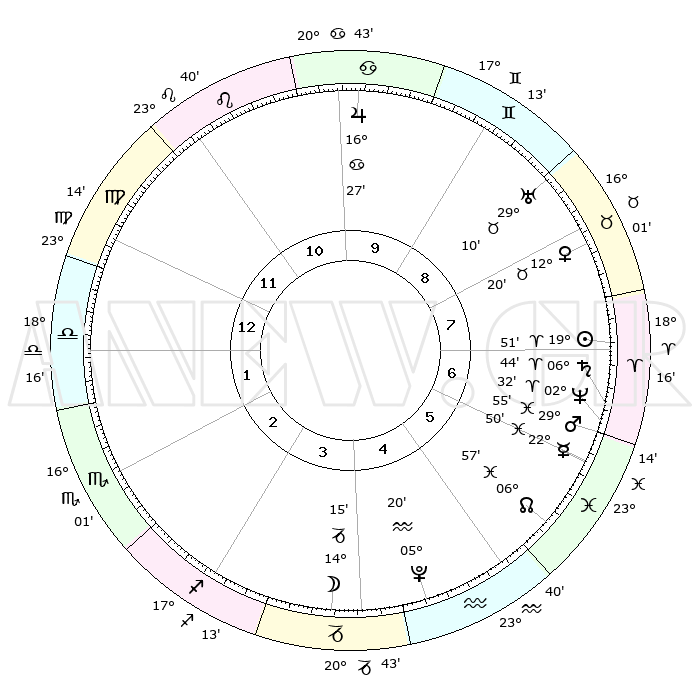 | | ΘΕΣΕΙΣ ΠΛΑΝΗΤΩΝ ΑΣΤΡΟΛΟΓΙΚΟΥ ΧΑΡΤΗ ΤΗΣ ΣΤΙΓΜΗΣ ΑΥΤΗΣ | | | | Πλανήτης | Ζώδιο | Μοίρες | Δεκαήμ. | Σε οίκο | Απόκλιση | | Ακμές των οίκων | | Ηλιος | Κριός | 19°47' | Δεύτερο | 7 | 07 N 44 | | 1ος | 28°02' | Παρθένος | | Σελήνη | Αιγόκερως | 13°25' | Δεύτερο | 4 | 26 S 57 | | 2ος | 24°28' | Ζυγός | | Ερμής | Ιχθείς | 22°45' | Τρίτο | 6 | 05 S 00 | | 3ος | 24°49' | Σκορπιός | | Αφροδίτη | Ταύρος | 12°15' | Δεύτερο | 8 | 15 N 26 | | 4ος | 27°47' | Τοξότης | | Αρης | Ιχθείς | 29°52' | Τρίτο | 7 | 00 S 59 | | 5ος | 00°47' | Υδροχόος | | Δίας | Καρκίνος | 16°27' | Δεύτερο | 10 | 22 N 48 | | 6ος | 01°18' | Ιχθείς | | Κρόνος | Κριός | 06°44' | Πρώτο | 7 | 00 N 42 | | 7ος | 28°02' | Ιχθείς | | Ουρανός | Ταύρος | 29°10' | Τρίτο | 9 | 19 N 48 | | 8ος | 24°28' | Κριός | | Ποσειδώνας | Κριός | 02°32' | Πρώτο | 7 | 00 S 12 | | 9ος | 24°50' | Ταύρος | | Πλούτωνας | Υδροχόος | 05°20' | Πρώτο | 5 | 22 S 47 | | 10ος | 27°47' | Δίδυμοι | | Β. Δεσμός | Ιχθείς | 06°57' | Πρώτο | 6 | 08 S 58 | | 11ος | 00°47' | Λέων | | Ωροσκόπος | Παρθένος | 28°02' | Τρίτο | | | 12ος | 01°18' | Παρθένος | | Μεσουράνημα | Δίδυμοι | 27°47' | Τρίτο | | | |