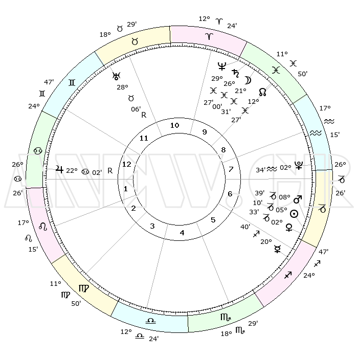 | | ΘΕΣΕΙΣ ΠΛΑΝΗΤΩΝ ΑΣΤΡΟΛΟΓΙΚΟΥ ΧΑΡΤΗ ΤΗΣ ΣΤΙΓΜΗΣ ΑΥΤΗΣ | | | | Πλανήτης | Ζώδιο | Μοίρες | Δεκαήμ. | Σε οίκο | Απόκλιση | | Ακμές των οίκων | | Ηλιος | Αιγόκερως | 05°06' | Πρώτο | 7 | 23 S 20 | | 1ος | 03°54' | Καρκίνος | | Σελήνη | Ιχθείς | 20°33' | Τρίτο | 10 | 02 S 59 | | 2ος | 24°30' | Καρκίνος | | Ερμής | Τοξότης | 20°33' | Τρίτο | 6 | 23 S 02 | | 3ος | 16°35' | Λέων | | Αφροδίτη | Αιγόκερως | 02°27' | Πρώτο | 6 | 23 S 43 | | 4ος | 13°32' | Παρθένος | | Αρης | Αιγόκερως | 08°35' | Πρώτο | 7 | 24 S 01 | | 5ος | 18°04' | Ζυγός | | Δίας | Καρκίνος | 22°02'R | Τρίτο | 1 | 21 N 51 | | 6ος | 27°43' | Σκορπιός | | Κρόνος | Ιχθείς | 25°60' | Τρίτο | 10 | 03 S 41 | | 7ος | 03°54' | Αιγόκερως | | Ουρανός | Ταύρος | 28°06'R | Τρίτο | 12 | 19 N 32 | | 8ος | 24°30' | Αιγόκερως | | Ποσειδώνας | Ιχθείς | 29°27' | Τρίτο | 10 | 01 S 27 | | 9ος | 16°35' | Υδροχόος | | Πλούτωνας | Υδροχόος | 02°34' | Πρώτο | 8 | 23 S 15 | | 10ος | 13°32' | Ιχθείς | | Β. Δεσμός | Ιχθείς | 12°27' | Δεύτερο | 9 | 06 S 53 | | 11ος | 18°04' | Κριός | | Ωροσκόπος | Καρκίνος | 03°54' | Πρώτο | | | 12ος | 27°44' | Ταύρος | | Μεσουράνημα | Ιχθείς | 13°32' | Δεύτερο | | | |
