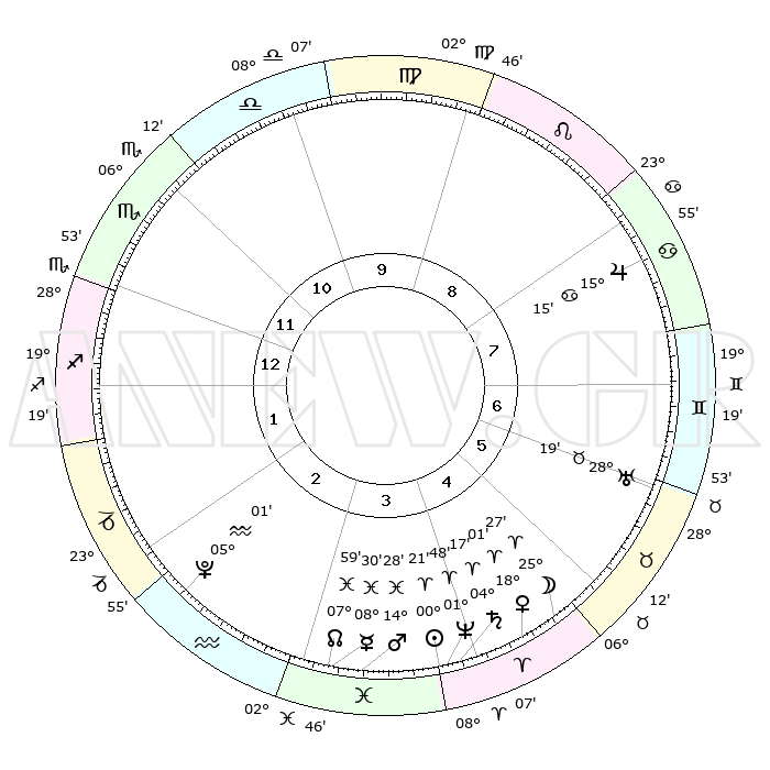 | | ΘΕΣΕΙΣ ΠΛΑΝΗΤΩΝ ΑΣΤΡΟΛΟΓΙΚΟΥ ΧΑΡΤΗ ΤΗΣ ΣΤΙΓΜΗΣ ΑΥΤΗΣ | | | | Πλανήτης | Ζώδιο | Μοίρες | Δεκαήμ. | Σε οίκο | Απόκλιση | | Ακμές των οίκων | | Ηλιος | Κριός | 00°16' | Πρώτο | 4 | 00 N 06 | | 1ος | 26°17' | Σκορπιός | | Σελήνη | Κριός | 24°21' | Τρίτο | 5 | 12 N 55 | | 2ος | 26°56' | Τοξότης | | Ερμής | Ιχθείς | 08°30'R | Πρώτο | 4 | 07 S 29 | | 3ος | 02°02' | Υδροχόος | | Αφροδίτη | Κριός | 17°56' | Δεύτερο | 5 | 06 N 14 | | 4ος | 07°58' | Ιχθείς | | Αρης | Ιχθείς | 14°24' | Δεύτερο | 4 | 07 S 08 | | 5ος | 09°26' | Κριός | | Δίας | Καρκίνος | 15°14' | Δεύτερο | 8 | 22 N 55 | | 6ος | 04°59' | Ταύρος | | Κρόνος | Κριός | 04°17' | Πρώτο | 4 | 00 S 15 | | 7ος | 26°17' | Ταύρος | | Ουρανός | Ταύρος | 28°19' | Τρίτο | 7 | 19 N 37 | | 8ος | 26°56' | Δίδυμοι | | Ποσειδώνας | Κριός | 01°47' | Πρώτο | 4 | 00 S 29 | | 9ος | 02°02' | Λέων | | Πλούτωνας | Υδροχόος | 05°01' | Πρώτο | 3 | 22 S 49 | | 10ος | 07°58' | Παρθένος | | Β. Δεσμός | Ιχθείς | 07°60' | Πρώτο | 4 | 08 S 34 | | 11ος | 09°26' | Ζυγός | | Ωροσκόπος | Σκορπιός | 26°17' | Τρίτο | | | 12ος | 04°59' | Σκορπιός | | Μεσουράνημα | Παρθένος | 07°58' | Πρώτο | | | |