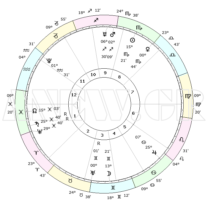 | | ΘΕΣΕΙΣ ΠΛΑΝΗΤΩΝ ΑΣΤΡΟΛΟΓΙΚΟΥ ΧΑΡΤΗ ΤΗΣ ΣΤΙΓΜΗΣ ΑΥΤΗΣ | | | | Πλανήτης | Ζώδιο | Μοίρες | Δεκαήμ. | Σε οίκο | Απόκλιση | | Ακμές των οίκων | | Ηλιος | Σκορπιός | 13°52' | Δεύτερο | 2 | 16 S 00 | | 1ος | 23°14' | Παρθένος | | Σελήνη | Ταύρος | 20°42' | Τρίτο | 9 | 22 N 19 | | 2ος | 19°18' | Ζυγός | | Ερμής | Τοξότης | 05°56' | Πρώτο | 3 | 24 S 00 | | 3ος | 19°27' | Σκορπιός | | Αφροδίτη | Ζυγός | 28°52' | Τρίτο | 2 | 09 S 46 | | 4ος | 22°23' | Τοξότης | | Αρης | Τοξότης | 01°05' | Πρώτο | 3 | 20 S 48 | | 5ος | 25°29' | Αιγόκερως | | Δίας | Καρκίνος | 25°06' | Τρίτο | 10 | 21 N 12 | | 6ος | 26°11' | Υδροχόος | | Κρόνος | Ιχθείς | 25°43'R | Τρίτο | 7 | 03 S 57 | | 7ος | 23°14' | Ιχθείς | | Ουρανός | Δίδυμοι | 00°05'R | Πρώτο | 9 | 19 N 57 | | 8ος | 19°18' | Κριός | | Ποσειδώνας | Ιχθείς | 29°42'R | Τρίτο | 7 | 01 S 23 | | 9ος | 19°27' | Ταύρος | | Πλούτωνας | Υδροχόος | 01°30' | Πρώτο | 5 | 23 S 30 | | 10ος | 22°23' | Δίδυμοι | | Β. Δεσμός | Ιχθείς | 15°08' | Δεύτερο | 6 | 05 S 51 | | 11ος | 25°29' | Καρκίνος | | Ωροσκόπος | Παρθένος | 23°14' | Τρίτο | | | 12ος | 26°11' | Λέων | | Μεσουράνημα | Δίδυμοι | 22°23' | Τρίτο | | | |