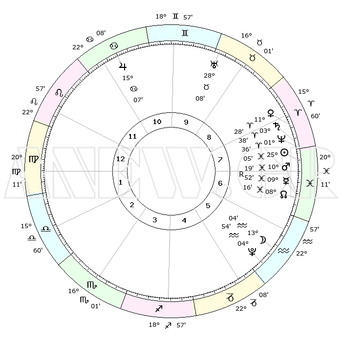 | | ΘΕΣΕΙΣ ΠΛΑΝΗΤΩΝ ΑΣΤΡΟΛΟΓΙΚΟΥ ΧΑΡΤΗ ΤΗΣ ΣΤΙΓΜΗΣ ΑΥΤΗΣ | | | | Πλανήτης | Ζώδιο | Μοίρες | Δεκαήμ. | Σε οίκο | Απόκλιση | | Ακμές των οίκων | | Ηλιος | Ιχθείς | 25°01' | Τρίτο | 7 | 01 S 59 | | 1ος | 02°16' | Παρθένος | | Σελήνη | Υδροχόος | 12°17' | Δεύτερο | 6 | 19 S 23 | | 2ος | 26°22' | Παρθένος | | Ερμής | Ιχθείς | 09°53'R | Πρώτο | 7 | 05 S 45 | | 3ος | 25°14' | Ζυγός | | Αφροδίτη | Κριός | 11°24' | Δεύτερο | 8 | 03 N 33 | | 4ος | 28°10' | Σκορπιός | | Αρης | Ιχθείς | 10°16' | Δεύτερο | 7 | 08 S 43 | | 5ος | 02°13' | Αιγόκερως | | Δίας | Καρκίνος | 15°07' | Δεύτερο | 11 | 22 N 56 | | 6ος | 03°60' | Υδροχόος | | Κρόνος | Κριός | 03°37' | Πρώτο | 8 | 00 S 31 | | 7ος | 02°16' | Ιχθείς | | Ουρανός | Ταύρος | 28°08' | Τρίτο | 9 | 19 N 34 | | 8ος | 26°22' | Ιχθείς | | Ποσειδώνας | Κριός | 01°35' | Πρώτο | 8 | 00 S 34 | | 9ος | 25°14' | Κριός | | Πλούτωνας | Υδροχόος | 04°54' | Πρώτο | 6 | 22 S 49 | | 10ος | 28°10' | Ταύρος | | Β. Δεσμός | Ιχθείς | 08°16' | Πρώτο | 7 | 08 S 28 | | 11ος | 02°13' | Καρκίνος | | Ωροσκόπος | Παρθένος | 02°16' | Πρώτο | | | 12ος | 03°60' | Λέων | | Μεσουράνημα | Ταύρος | 28°10' | Τρίτο | | | |