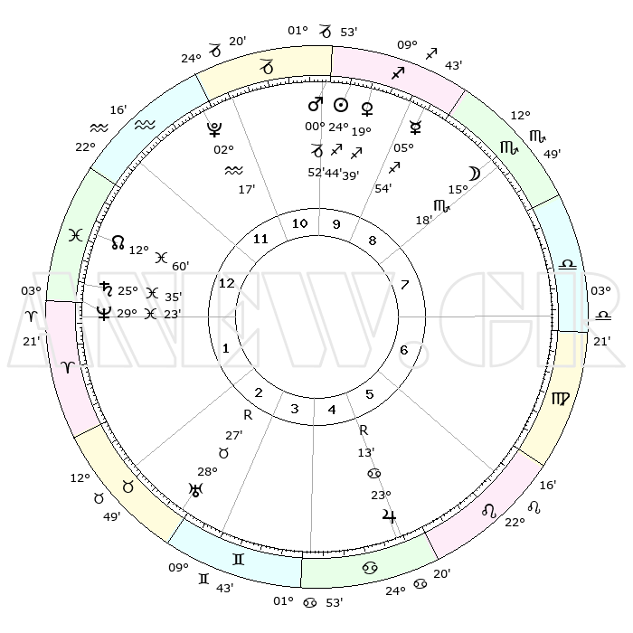 | | ΘΕΣΕΙΣ ΠΛΑΝΗΤΩΝ ΑΣΤΡΟΛΟΓΙΚΟΥ ΧΑΡΤΗ ΤΗΣ ΣΤΙΓΜΗΣ ΑΥΤΗΣ | | | | Πλανήτης | Ζώδιο | Μοίρες | Δεκαήμ. | Σε οίκο | Απόκλιση | | Ακμές των οίκων | | Ηλιος | Τοξότης | 24°30' | Τρίτο | 1 | 23 S 19 | | 1ος | 22°15' | Τοξότης | | Σελήνη | Σκορπιός | 12°39' | Δεύτερο | 11 | 19 S 45 | | 2ος | 27°31' | Αιγόκερως | | Ερμής | Τοξότης | 05°35' | Πρώτο | 12 | 19 S 52 | | 3ος | 06°45' | Ιχθείς | | Αφροδίτη | Τοξότης | 19°22' | Δεύτερο | 12 | 22 S 54 | | 4ος | 11°46' | Κριός | | Αρης | Αιγόκερως | 00°42' | Πρώτο | 1 | 24 S 13 | | 5ος | 09°22' | Ταύρος | | Δίας | Καρκίνος | 23°14'R | Τρίτο | 7 | 21 N 38 | | 6ος | 01°46' | Δίδυμοι | | Κρόνος | Ιχθείς | 25°34' | Τρίτο | 3 | 03 S 53 | | 7ος | 22°15' | Δίδυμοι | | Ουρανός | Ταύρος | 28°27'R | Τρίτο | 5 | 19 N 37 | | 8ος | 27°31' | Καρκίνος | | Ποσειδώνας | Ιχθείς | 29°23' | Τρίτο | 3 | 01 S 29 | | 9ος | 06°45' | Παρθένος | | Πλούτωνας | Υδροχόος | 02°16' | Πρώτο | 2 | 23 S 19 | | 10ος | 11°46' | Ζυγός | | Β. Δεσμός | Ιχθείς | 13°00' | Δεύτερο | 3 | 06 S 41 | | 11ος | 09°22' | Σκορπιός | | Ωροσκόπος | Τοξότης | 22°15' | Τρίτο | | | 12ος | 01°46' | Τοξότης | | Μεσουράνημα | Ζυγός | 11°46' | Δεύτερο | | | |