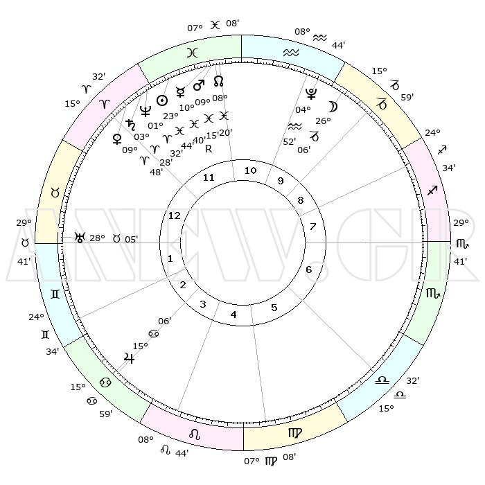 | | ΘΕΣΕΙΣ ΠΛΑΝΗΤΩΝ ΑΣΤΡΟΛΟΓΙΚΟΥ ΧΑΡΤΗ ΤΗΣ ΣΤΙΓΜΗΣ ΑΥΤΗΣ | | | | Πλανήτης | Ζώδιο | Μοίρες | Δεκαήμ. | Σε οίκο | Απόκλιση | | Ακμές των οίκων | | Ηλιος | Ιχθείς | 23°40' | Τρίτο | 12 | 02 S 31 | | 1ος | 24°33' | Κριός | | Σελήνη | Αιγόκερως | 25°13' | Τρίτο | 10 | 24 S 41 | | 2ος | 28°17' | Ταύρος | | Ερμής | Ιχθείς | 10°43'R | Δεύτερο | 12 | 05 S 09 | | 3ος | 22°26' | Δίδυμοι | | Αφροδίτη | Κριός | 09°42' | Πρώτο | 12 | 02 N 52 | | 4ος | 14°07' | Καρκίνος | | Αρης | Ιχθείς | 09°11' | Πρώτο | 11 | 09 S 08 | | 5ος | 08°01' | Λέων | | Δίας | Καρκίνος | 15°06' | Δεύτερο | 4 | 22 N 56 | | 6ος | 09°40' | Παρθένος | | Κρόνος | Κριός | 03°27' | Πρώτο | 12 | 00 S 35 | | 7ος | 24°33' | Ζυγός | | Ουρανός | Ταύρος | 28°05' | Τρίτο | 1 | 19 N 33 | | 8ος | 28°17' | Σκορπιός | | Ποσειδώνας | Κριός | 01°32' | Πρώτο | 12 | 00 S 35 | | 9ος | 22°26' | Τοξότης | | Πλούτωνας | Υδροχόος | 04°52' | Πρώτο | 10 | 22 S 50 | | 10ος | 14°07' | Αιγόκερως | | Β. Δεσμός | Ιχθείς | 08°21' | Πρώτο | 11 | 08 S 26 | | 11ος | 08°01' | Υδροχόος | | Ωροσκόπος | Κριός | 24°33' | Τρίτο | | | 12ος | 09°40' | Ιχθείς | | Μεσουράνημα | Αιγόκερως | 14°07' | Δεύτερο | | | |