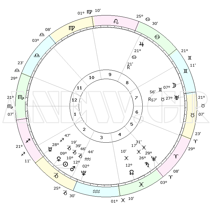 | | ΘΕΣΕΙΣ ΠΛΑΝΗΤΩΝ ΑΣΤΡΟΛΟΓΙΚΟΥ ΧΑΡΤΗ ΤΗΣ ΣΤΙΓΜΗΣ ΑΥΤΗΣ | | | | Πλανήτης | Ζώδιο | Μοίρες | Δεκαήμ. | Σε οίκο | Απόκλιση | | Ακμές των οίκων | | Ηλιος | Αιγόκερως | 10°34' | Δεύτερο | 3 | 23 S 01 | | 1ος | 28°34' | Ζυγός | | Σελήνη | Δίδυμοι | 06°46' | Πρώτο | 8 | 26 N 25 | | 2ος | 26°54' | Σκορπιός | | Ερμής | Τοξότης | 28°40' | Τρίτο | 2 | 24 S 00 | | 3ος | 28°45' | Τοξότης | | Αφροδίτη | Αιγόκερως | 09°13' | Πρώτο | 3 | 23 S 37 | | 4ος | 02°50' | Υδροχόος | | Αρης | Αιγόκερως | 12°42' | Δεύτερο | 3 | 23 S 43 | | 5ος | 05°46' | Ιχθείς | | Δίας | Καρκίνος | 21°21'R | Τρίτο | 9 | 21 N 59 | | 6ος | 04°34' | Κριός | | Κρόνος | Ιχθείς | 26°17' | Τρίτο | 5 | 03 S 33 | | 7ος | 28°34' | Κριός | | Ουρανός | Ταύρος | 27°57'R | Τρίτο | 8 | 19 N 30 | | 8ος | 26°54' | Ταύρος | | Ποσειδώνας | Ιχθείς | 29°30' | Τρίτο | 5 | 01 S 25 | | 9ος | 28°45' | Δίδυμοι | | Πλούτωνας | Υδροχόος | 02°43' | Πρώτο | 3 | 23 S 13 | | 10ος | 02°50' | Λέων | | Β. Δεσμός | Ιχθείς | 12°10' | Δεύτερο | 5 | 07 S 00 | | 11ος | 05°46' | Παρθένος | | Ωροσκόπος | Ζυγός | 28°34' | Τρίτο | | | 12ος | 04°34' | Ζυγός | | Μεσουράνημα | Λέων | 02°50' | Πρώτο | | | |