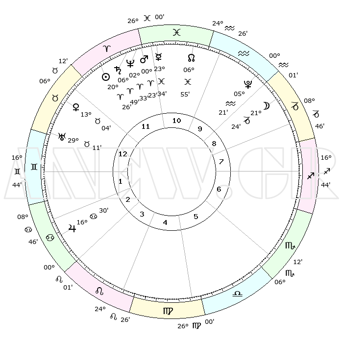 | | ΘΕΣΕΙΣ ΠΛΑΝΗΤΩΝ ΑΣΤΡΟΛΟΓΙΚΟΥ ΧΑΡΤΗ ΤΗΣ ΣΤΙΓΜΗΣ ΑΥΤΗΣ | | | | Πλανήτης | Ζώδιο | Μοίρες | Δεκαήμ. | Σε οίκο | Απόκλιση | | Ακμές των οίκων | | Ηλιος | Κριός | 20°21' | Τρίτο | 12 | 07 N 57 | | 1ος | 14°12' | Ταύρος | | Σελήνη | Αιγόκερως | 20°28' | Τρίτο | 9 | 25 S 39 | | 2ος | 12°38' | Δίδυμοι | | Ερμής | Ιχθείς | 23°28' | Τρίτο | 11 | 04 S 45 | | 3ος | 04°56' | Καρκίνος | | Αφροδίτη | Ταύρος | 12°58' | Δεύτερο | 12 | 15 N 41 | | 4ος | 26°52' | Καρκίνος | | Αρης | Κριός | 00°19' | Πρώτο | 12 | 00 S 48 | | 5ος | 22°55' | Λέων | | Δίας | Καρκίνος | 16°30' | Δεύτερο | 3 | 22 N 47 | | 6ος | 28°28' | Παρθένος | | Κρόνος | Κριός | 06°48' | Πρώτο | 12 | 00 N 44 | | 7ος | 14°12' | Σκορπιός | | Ουρανός | Ταύρος | 29°11' | Τρίτο | 1 | 19 N 48 | | 8ος | 12°38' | Τοξότης | | Ποσειδώνας | Κριός | 02°33' | Πρώτο | 12 | 00 S 11 | | 9ος | 04°56' | Αιγόκερως | | Πλούτωνας | Υδροχόος | 05°21' | Πρώτο | 10 | 22 S 47 | | 10ος | 26°52' | Αιγόκερως | | Β. Δεσμός | Ιχθείς | 06°55' | Πρώτο | 11 | 08 S 58 | | 11ος | 22°55' | Υδροχόος | | Ωροσκόπος | Ταύρος | 14°12' | Δεύτερο | | | 12ος | 28°28' | Ιχθείς | | Μεσουράνημα | Αιγόκερως | 26°52' | Τρίτο | | | |