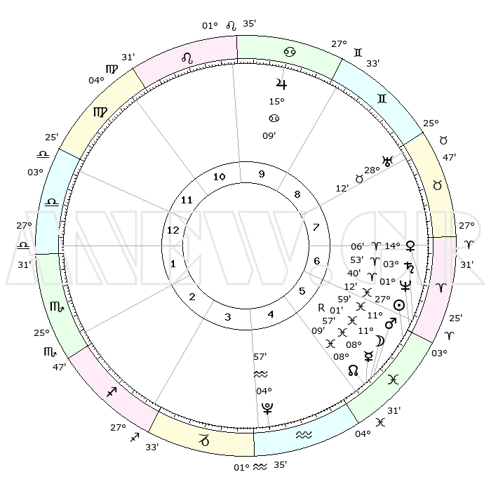 | | ΘΕΣΕΙΣ ΠΛΑΝΗΤΩΝ ΑΣΤΡΟΛΟΓΙΚΟΥ ΧΑΡΤΗ ΤΗΣ ΣΤΙΓΜΗΣ ΑΥΤΗΣ | | | | Πλανήτης | Ζώδιο | Μοίρες | Δεκαήμ. | Σε οίκο | Απόκλιση | | Ακμές των οίκων | | Ηλιος | Ιχθείς | 27°08' | Τρίτο | 6 | 01 S 08 | | 1ος | 07°22' | Ζυγός | | Σελήνη | Ιχθείς | 10°05' | Δεύτερο | 5 | 07 S 42 | | 2ος | 04°27' | Σκορπιός | | Ερμής | Ιχθείς | 08°59'R | Πρώτο | 5 | 06 S 35 | | 3ος | 05°10' | Τοξότης | | Αφροδίτη | Κριός | 14°01' | Δεύτερο | 7 | 04 N 38 | | 4ος | 08°16' | Αιγόκερως | | Αρης | Ιχθείς | 11°55' | Δεύτερο | 6 | 08 S 05 | | 5ος | 11°12' | Υδροχόος | | Δίας | Καρκίνος | 15°09' | Δεύτερο | 10 | 22 N 56 | | 6ος | 11°20' | Ιχθείς | | Κρόνος | Κριός | 03°53' | Πρώτο | 6 | 00 S 24 | | 7ος | 07°22' | Κριός | | Ουρανός | Ταύρος | 28°12' | Τρίτο | 8 | 19 N 35 | | 8ος | 04°27' | Ταύρος | | Ποσειδώνας | Κριός | 01°40' | Πρώτο | 6 | 00 S 32 | | 9ος | 05°10' | Δίδυμοι | | Πλούτωνας | Υδροχόος | 04°57' | Πρώτο | 4 | 22 S 49 | | 10ος | 08°17' | Καρκίνος | | Β. Δεσμός | Ιχθείς | 08°10' | Πρώτο | 5 | 08 S 30 | | 11ος | 11°12' | Λέων | | Ωροσκόπος | Ζυγός | 07°22' | Πρώτο | | | 12ος | 11°20' | Παρθένος | | Μεσουράνημα | Καρκίνος | 08°17' | Πρώτο | | | |