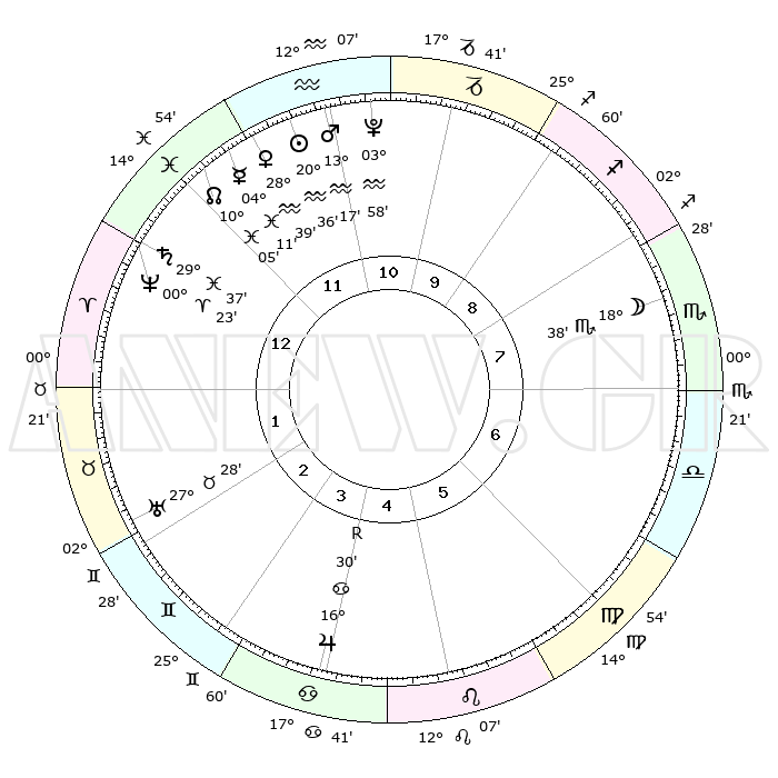 | | ΘΕΣΕΙΣ ΠΛΑΝΗΤΩΝ ΑΣΤΡΟΛΟΓΙΚΟΥ ΧΑΡΤΗ ΤΗΣ ΣΤΙΓΜΗΣ ΑΥΤΗΣ | | | | Πλανήτης | Ζώδιο | Μοίρες | Δεκαήμ. | Σε οίκο | Απόκλιση | | Ακμές των οίκων | | Ηλιος | Υδροχόος | 20°31' | Τρίτο | 12 | 14 S 39 | | 1ος | 16°43' | Ιχθείς | | Σελήνη | Σκορπιός | 17°44' | Δεύτερο | 8 | 21 S 48 | | 2ος | 29°53' | Κριός | | Ερμής | Ιχθείς | 04°03' | Πρώτο | 12 | 10 S 58 | | 3ος | 29°28' | Ταύρος | | Αφροδίτη | Υδροχόος | 28°34' | Τρίτο | 12 | 13 S 20 | | 4ος | 22°30' | Δίδυμοι | | Αρης | Υδροχόος | 13°14' | Δεύτερο | 12 | 17 S 52 | | 5ος | 14°21' | Καρκίνος | | Δίας | Καρκίνος | 16°31'R | Δεύτερο | 5 | 22 N 44 | | 6ος | 09°52' | Λέων | | Κρόνος | Ιχθείς | 29°36' | Τρίτο | 1 | 02 S 08 | | 7ος | 16°43' | Παρθένος | | Ουρανός | Ταύρος | 27°28' | Τρίτο | 2 | 19 N 24 | | 8ος | 29°53' | Ζυγός | | Ποσειδώνας | Κριός | 00°23' | Πρώτο | 1 | 01 S 03 | | 9ος | 29°28' | Σκορπιός | | Πλούτωνας | Υδροχόος | 03°58' | Πρώτο | 11 | 22 S 58 | | 10ος | 22°30' | Τοξότης | | Β. Δεσμός | Ιχθείς | 10°05' | Δεύτερο | 12 | 07 S 47 | | 11ος | 14°21' | Αιγόκερως | | Ωροσκόπος | Ιχθείς | 16°43' | Δεύτερο | | | 12ος | 09°52' | Υδροχόος | | Μεσουράνημα | Τοξότης | 22°30' | Τρίτο | | | |