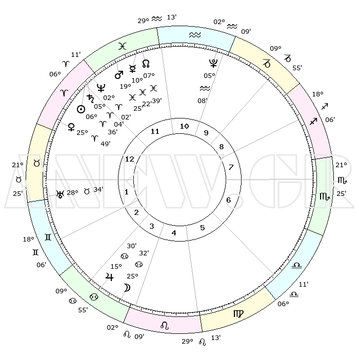| | ΘΕΣΕΙΣ ΠΛΑΝΗΤΩΝ ΑΣΤΡΟΛΟΓΙΚΟΥ ΧΑΡΤΗ ΤΗΣ ΣΤΙΓΜΗΣ ΑΥΤΗΣ | | | | Πλανήτης | Ζώδιο | Μοίρες | Δεκαήμ. | Σε οίκο | Απόκλιση | | Ακμές των οίκων | | Ηλιος | Κριός | 06°33' | Πρώτο | 12 | 02 N 36 | | 1ος | 19°08' | Κριός | | Σελήνη | Καρκίνος | 24°41' | Τρίτο | 4 | 24 N 46 | | 2ος | 24°23' | Ταύρος | | Ερμής | Ιχθείς | 10°20' | Δεύτερο | 12 | 08 S 07 | | 3ος | 19°09' | Δίδυμοι | | Αφροδίτη | Κριός | 25°44' | Τρίτο | 1 | 09 N 21 | | 4ος | 10°54' | Καρκίνος | | Αρης | Ιχθείς | 19°22' | Δεύτερο | 12 | 05 S 11 | | 5ος | 04°21' | Λέων | | Δίας | Καρκίνος | 15°30' | Δεύτερο | 4 | 22 N 54 | | 6ος | 04°59' | Παρθένος | | Κρόνος | Κριός | 05°04' | Πρώτο | 12 | 00 N 04 | | 7ος | 19°08' | Ζυγός | | Ουρανός | Ταύρος | 28°34' | Τρίτο | 2 | 19 N 40 | | 8ος | 24°23' | Σκορπιός | | Ποσειδώνας | Κριός | 02°02' | Πρώτο | 12 | 00 S 24 | | 9ος | 19°09' | Τοξότης | | Πλούτωνας | Υδροχόος | 05°08' | Πρώτο | 11 | 22 S 48 | | 10ος | 10°54' | Αιγόκερως | | Β. Δεσμός | Ιχθείς | 07°39' | Πρώτο | 12 | 08 S 42 | | 11ος | 04°21' | Υδροχόος | | Ωροσκόπος | Κριός | 19°08' | Δεύτερο | | | 12ος | 04°59' | Ιχθείς | | Μεσουράνημα | Αιγόκερως | 10°54' | Δεύτερο | | | |