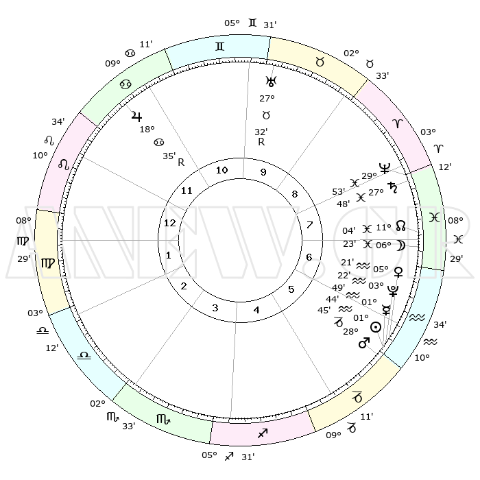 | | ΘΕΣΕΙΣ ΠΛΑΝΗΤΩΝ ΑΣΤΡΟΛΟΓΙΚΟΥ ΧΑΡΤΗ ΤΗΣ ΣΤΙΓΜΗΣ ΑΥΤΗΣ | | | | Πλανήτης | Ζώδιο | Μοίρες | Δεκαήμ. | Σε οίκο | Απόκλιση | | Ακμές των οίκων | | Ηλιος | Υδροχόος | 01°39' | Πρώτο | 6 | 19 S 47 | | 1ος | 14°04' | Λέων | | Σελήνη | Ιχθείς | 05°17' | Πρώτο | 7 | 09 S 55 | | 2ος | 06°17' | Παρθένος | | Ερμής | Υδροχόος | 01°41' | Πρώτο | 6 | 21 S 47 | | 3ος | 03°12' | Ζυγός | | Αφροδίτη | Υδροχόος | 05°14' | Πρώτο | 6 | 20 S 05 | | 4ος | 05°34' | Σκορπιός | | Αρης | Αιγόκερως | 28°41' | Τρίτο | 6 | 21 S 24 | | 5ος | 10°54' | Τοξότης | | Δίας | Καρκίνος | 18°36'R | Δεύτερο | 12 | 22 N 26 | | 6ος | 14°30' | Αιγόκερως | | Κρόνος | Ιχθείς | 27°48' | Τρίτο | 8 | 02 S 54 | | 7ος | 14°04' | Υδροχόος | | Ουρανός | Ταύρος | 27°32'R | Τρίτο | 10 | 19 N 25 | | 8ος | 06°17' | Ιχθείς | | Ποσειδώνας | Ιχθείς | 29°53' | Τρίτο | 8 | 01 S 16 | | 9ος | 03°12' | Κριός | | Πλούτωνας | Υδροχόος | 03°22' | Πρώτο | 6 | 23 S 05 | | 10ος | 05°34' | Ταύρος | | Β. Δεσμός | Ιχθείς | 11°04' | Δεύτερο | 8 | 07 S 25 | | 11ος | 10°54' | Δίδυμοι | | Ωροσκόπος | Λέων | 14°04' | Δεύτερο | | | 12ος | 14°30' | Καρκίνος | | Μεσουράνημα | Ταύρος | 05°34' | Πρώτο | | | |
