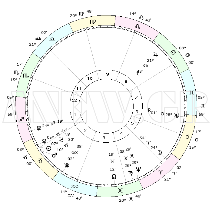 | | ΘΕΣΕΙΣ ΠΛΑΝΗΤΩΝ ΑΣΤΡΟΛΟΓΙΚΟΥ ΧΑΡΤΗ ΤΗΣ ΣΤΙΓΜΗΣ ΑΥΤΗΣ | | | | Πλανήτης | Ζώδιο | Μοίρες | Δεκαήμ. | Σε οίκο | Απόκλιση | | Ακμές των οίκων | | Ηλιος | Αιγόκερως | 07°35' | Πρώτο | 2 | 23 S 13 | | 1ος | 14°32' | Σκορπιός | | Σελήνη | Κριός | 23°51' | Τρίτο | 6 | 12 N 27 | | 2ος | 13°58' | Τοξότης | | Ερμής | Τοξότης | 24°13' | Τρίτο | 2 | 23 S 33 | | 3ος | 17°23' | Αιγόκερως | | Αφροδίτη | Αιγόκερως | 05°31' | Πρώτο | 2 | 23 S 43 | | 4ος | 22°38' | Υδροχόος | | Αρης | Αιγόκερως | 10°27' | Δεύτερο | 2 | 23 S 53 | | 5ος | 25°05' | Ιχθείς | | Δίας | Καρκίνος | 21°44'R | Τρίτο | 9 | 21 N 54 | | 6ος | 22°11' | Κριός | | Κρόνος | Ιχθείς | 26°07' | Τρίτο | 5 | 03 S 37 | | 7ος | 14°32' | Ταύρος | | Ουρανός | Ταύρος | 28°02'R | Τρίτο | 7 | 19 N 31 | | 8ος | 13°58' | Δίδυμοι | | Ποσειδώνας | Ιχθείς | 29°28' | Τρίτο | 5 | 01 S 26 | | 9ος | 17°23' | Καρκίνος | | Πλούτωνας | Υδροχόος | 02°38' | Πρώτο | 3 | 23 S 14 | | 10ος | 22°38' | Λέων | | Β. Δεσμός | Ιχθείς | 12°19' | Δεύτερο | 4 | 06 S 56 | | 11ος | 25°05' | Παρθένος | | Ωροσκόπος | Σκορπιός | 14°32' | Δεύτερο | | | 12ος | 22°11' | Ζυγός | | Μεσουράνημα | Λέων | 22°38' | Τρίτο | | | |