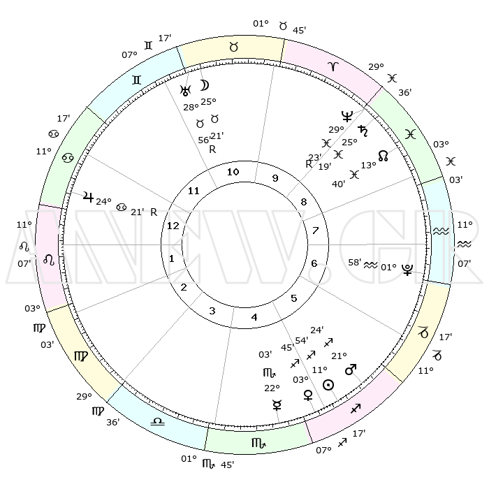 | | ΘΕΣΕΙΣ ΠΛΑΝΗΤΩΝ ΑΣΤΡΟΛΟΓΙΚΟΥ ΧΑΡΤΗ ΤΗΣ ΣΤΙΓΜΗΣ ΑΥΤΗΣ | | | | Πλανήτης | Ζώδιο | Μοίρες | Δεκαήμ. | Σε οίκο | Απόκλιση | | Ακμές των οίκων | | Ηλιος | Τοξότης | 11°51' | Δεύτερο | 5 | 22 S 12 | | 1ος | 00°38' | Λέων | | Σελήνη | Ταύρος | 24°48' | Τρίτο | 11 | 23 N 33 | | 2ος | 21°42' | Λέων | | Ερμής | Σκορπιός | 22°02' | Τρίτο | 4 | 15 S 46 | | 3ος | 16°50' | Παρθένος | | Αφροδίτη | Τοξότης | 03°42' | Πρώτο | 5 | 20 S 18 | | 4ος | 17°57' | Ζυγός | | Αρης | Τοξότης | 21°22' | Τρίτο | 5 | 23 S 50 | | 5ος | 23°59' | Σκορπιός | | Δίας | Καρκίνος | 24°21'R | Τρίτο | 12 | 21 N 24 | | 6ος | 29°35' | Τοξότης | | Κρόνος | Ιχθείς | 25°19' | Τρίτο | 9 | 04 S 02 | | 7ος | 00°38' | Υδροχόος | | Ουρανός | Ταύρος | 28°56'R | Τρίτο | 11 | 19 N 43 | | 8ος | 21°42' | Υδροχόος | | Ποσειδώνας | Ιχθείς | 29°23'R | Τρίτο | 9 | 01 S 29 | | 9ος | 16°50' | Ιχθείς | | Πλούτωνας | Υδροχόος | 01°58' | Πρώτο | 7 | 23 S 23 | | 10ος | 17°57' | Κριός | | Β. Δεσμός | Ιχθείς | 13°40' | Δεύτερο | 8 | 06 S 25 | | 11ος | 23°59' | Ταύρος | | Ωροσκόπος | Λέων | 00°38' | Πρώτο | | | 12ος | 29°35' | Δίδυμοι | | Μεσουράνημα | Κριός | 17°57' | Δεύτερο | | | |