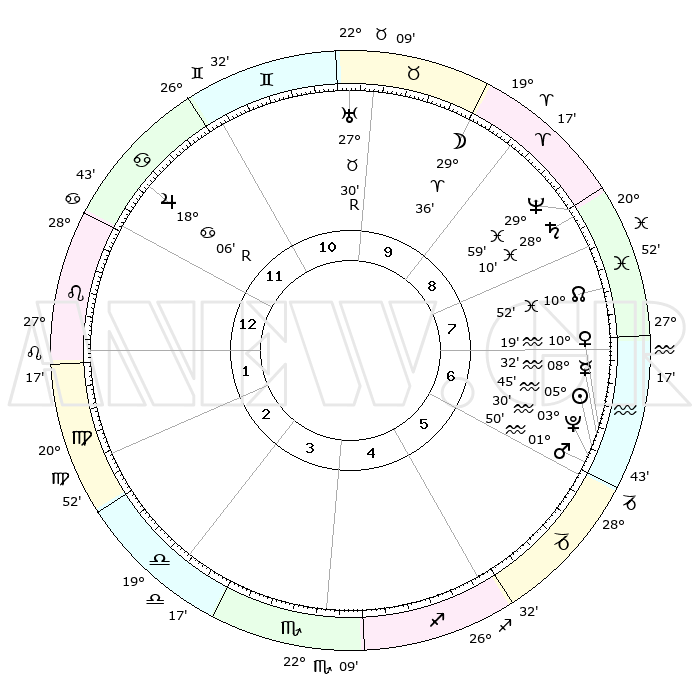 | | ΘΕΣΕΙΣ ΠΛΑΝΗΤΩΝ ΑΣΤΡΟΛΟΓΙΚΟΥ ΧΑΡΤΗ ΤΗΣ ΣΤΙΓΜΗΣ ΑΥΤΗΣ | | | | Πλανήτης | Ζώδιο | Μοίρες | Δεκαήμ. | Σε οίκο | Απόκλιση | | Ακμές των οίκων | | Ηλιος | Υδροχόος | 05°41' | Πρώτο | 6 | 18 S 51 | | 1ος | 08°23' | Λέων | | Σελήνη | Κριός | 28°41' | Τρίτο | 10 | 14 N 42 | | 2ος | 00°04' | Παρθένος | | Ερμής | Υδροχόος | 08°26' | Πρώτο | 7 | 20 S 10 | | 3ος | 26°15' | Παρθένος | | Αφροδίτη | Υδροχόος | 10°14' | Δεύτερο | 7 | 18 S 53 | | 4ος | 28°11' | Ζυγός | | Αρης | Υδροχόος | 01°47' | Πρώτο | 6 | 20 S 45 | | 5ος | 03°53' | Τοξότης | | Δίας | Καρκίνος | 18°06'R | Δεύτερο | 12 | 22 N 30 | | 6ος | 08°16' | Αιγόκερως | | Κρόνος | Ιχθείς | 28°09' | Τρίτο | 9 | 02 S 45 | | 7ος | 08°23' | Υδροχόος | | Ουρανός | Ταύρος | 27°30'R | Τρίτο | 10 | 19 N 25 | | 8ος | 00°04' | Ιχθείς | | Ποσειδώνας | Ιχθείς | 29°59' | Τρίτο | 9 | 01 S 13 | | 9ος | 26°15' | Ιχθείς | | Πλούτωνας | Υδροχόος | 03°30' | Πρώτο | 6 | 23 S 04 | | 10ος | 28°11' | Κριός | | Β. Δεσμός | Ιχθείς | 10°52' | Δεύτερο | 8 | 07 S 29 | | 11ος | 03°53' | Δίδυμοι | | Ωροσκόπος | Λέων | 08°23' | Πρώτο | | | 12ος | 08°16' | Καρκίνος | | Μεσουράνημα | Κριός | 28°11' | Τρίτο | | | |