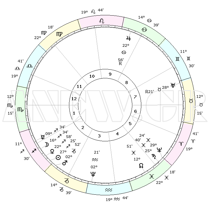 | | ΘΕΣΕΙΣ ΠΛΑΝΗΤΩΝ ΑΣΤΡΟΛΟΓΙΚΟΥ ΧΑΡΤΗ ΤΗΣ ΣΤΙΓΜΗΣ ΑΥΤΗΣ | | | | Πλανήτης | Ζώδιο | Μοίρες | Δεκαήμ. | Σε οίκο | Απόκλιση | | Ακμές των οίκων | | Ηλιος | Τοξότης | 27°01' | Τρίτο | 6 | 23 S 24 | | 1ος | 18°29' | Καρκίνος | | Σελήνη | Τοξότης | 11°55' | Δεύτερο | 5 | 27 S 10 | | 2ος | 08°59' | Λέων | | Ερμής | Τοξότης | 09°01' | Πρώτο | 5 | 20 S 45 | | 3ος | 02°33' | Παρθένος | | Αφροδίτη | Τοξότης | 22°28' | Τρίτο | 6 | 23 S 12 | | 4ος | 01°55' | Ζυγός | | Αρης | Αιγόκερως | 02°34' | Πρώτο | 6 | 24 S 13 | | 5ος | 07°51' | Σκορπιός | | Δίας | Καρκίνος | 22°58'R | Τρίτο | 1 | 21 N 41 | | 6ος | 15°29' | Τοξότης | | Κρόνος | Ιχθείς | 25°39' | Τρίτο | 9 | 03 S 51 | | 7ος | 18°29' | Αιγόκερως | | Ουρανός | Ταύρος | 28°22'R | Τρίτο | 11 | 19 N 36 | | 8ος | 08°59' | Υδροχόος | | Ποσειδώνας | Ιχθείς | 29°24' | Τρίτο | 9 | 01 S 28 | | 9ος | 02°33' | Ιχθείς | | Πλούτωνας | Υδροχόος | 02°20' | Πρώτο | 7 | 23 S 18 | | 10ος | 01°55' | Κριός | | Β. Δεσμός | Ιχθείς | 12°52' | Δεύτερο | 9 | 06 S 44 | | 11ος | 07°51' | Ταύρος | | Ωροσκόπος | Καρκίνος | 18°29' | Δεύτερο | | | 12ος | 15°29' | Δίδυμοι | | Μεσουράνημα | Κριός | 01°55' | Πρώτο | | | |