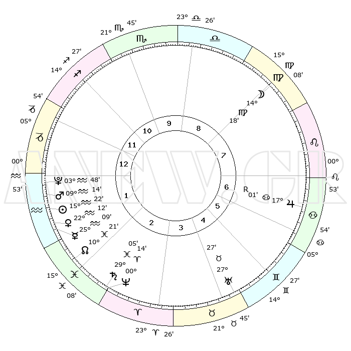 | | ΘΕΣΕΙΣ ΠΛΑΝΗΤΩΝ ΑΣΤΡΟΛΟΓΙΚΟΥ ΧΑΡΤΗ ΤΗΣ ΣΤΙΓΜΗΣ ΑΥΤΗΣ | | | | Πλανήτης | Ζώδιο | Μοίρες | Δεκαήμ. | Σε οίκο | Απόκλιση | | Ακμές των οίκων | | Ηλιος | Υδροχόος | 15°19' | Δεύτερο | 1 | 16 S 14 | | 1ος | 11°31' | Αιγόκερως | | Σελήνη | Παρθένος | 13°39' | Δεύτερο | 8 | 06 N 02 | | 2ος | 21°37' | Υδροχόος | | Ερμής | Υδροχόος | 25°04' | Τρίτο | 2 | 14 S 43 | | 3ος | 01°53' | Κριός | | Αφροδίτη | Υδροχόος | 22°08' | Τρίτο | 2 | 15 S 27 | | 4ος | 03°46' | Ταύρος | | Αρης | Υδροχόος | 09°12' | Πρώτο | 1 | 18 S 58 | | 5ος | 28°25' | Ταύρος | | Δίας | Καρκίνος | 17°01'R | Δεύτερο | 7 | 22 N 39 | | 6ος | 19°42' | Δίδυμοι | | Κρόνος | Ιχθείς | 29°04' | Τρίτο | 2 | 02 S 21 | | 7ος | 11°31' | Καρκίνος | | Ουρανός | Ταύρος | 27°27' | Τρίτο | 4 | 19 N 24 | | 8ος | 21°37' | Λέων | | Ποσειδώνας | Κριός | 00°14' | Πρώτο | 2 | 01 S 07 | | 9ος | 01°53' | Ζυγός | | Πλούτωνας | Υδροχόος | 03°48' | Πρώτο | 1 | 23 S 00 | | 10ος | 03°46' | Σκορπιός | | Β. Δεσμός | Ιχθείς | 10°22' | Δεύτερο | 2 | 07 S 41 | | 11ος | 28°25' | Σκορπιός | | Ωροσκόπος | Αιγόκερως | 11°31' | Δεύτερο | | | 12ος | 19°42' | Τοξότης | | Μεσουράνημα | Σκορπιός | 03°46' | Πρώτο | | | |
