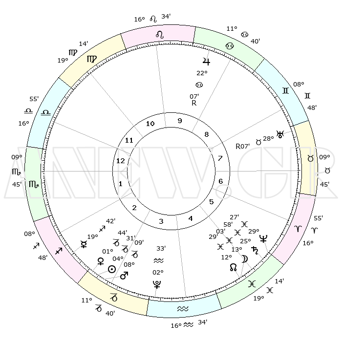 | | ΘΕΣΕΙΣ ΠΛΑΝΗΤΩΝ ΑΣΤΡΟΛΟΓΙΚΟΥ ΧΑΡΤΗ ΤΗΣ ΣΤΙΓΜΗΣ ΑΥΤΗΣ | | | | Πλανήτης | Ζώδιο | Μοίρες | Δεκαήμ. | Σε οίκο | Απόκλιση | | Ακμές των οίκων | | Ηλιος | Αιγόκερως | 04°26' | Πρώτο | 3 | 23 S 21 | | 1ος | 18°30' | Ζυγός | | Σελήνη | Ιχθείς | 12°06' | Δεύτερο | 5 | 06 S 57 | | 2ος | 16°16' | Σκορπιός | | Ερμής | Τοξότης | 19°36' | Δεύτερο | 3 | 22 S 53 | | 3ος | 17°28' | Τοξότης | | Αφροδίτη | Αιγόκερως | 01°39' | Πρώτο | 3 | 23 S 42 | | 4ος | 20°59' | Αιγόκερως | | Αρης | Αιγόκερως | 08°06' | Πρώτο | 3 | 24 S 02 | | 5ος | 23°56' | Υδροχόος | | Δίας | Καρκίνος | 22°07'R | Τρίτο | 10 | 21 N 50 | | 6ος | 23°29' | Ιχθείς | | Κρόνος | Ιχθείς | 25°58' | Τρίτο | 6 | 03 S 42 | | 7ος | 18°30' | Κριός | | Ουρανός | Ταύρος | 28°07'R | Τρίτο | 8 | 19 N 33 | | 8ος | 16°16' | Ταύρος | | Ποσειδώνας | Ιχθείς | 29°27' | Τρίτο | 6 | 01 S 27 | | 9ος | 17°28' | Δίδυμοι | | Πλούτωνας | Υδροχόος | 02°33' | Πρώτο | 4 | 23 S 15 | | 10ος | 20°59' | Καρκίνος | | Β. Δεσμός | Ιχθείς | 12°29' | Δεύτερο | 5 | 06 S 52 | | 11ος | 23°56' | Λέων | | Ωροσκόπος | Ζυγός | 18°30' | Δεύτερο | | | 12ος | 23°29' | Παρθένος | | Μεσουράνημα | Καρκίνος | 20°59' | Τρίτο | | | |