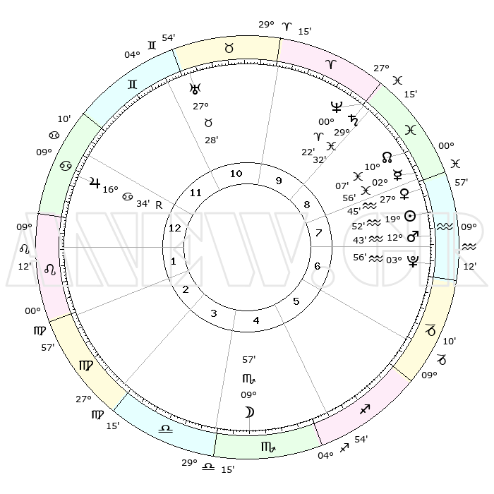 | | ΘΕΣΕΙΣ ΠΛΑΝΗΤΩΝ ΑΣΤΡΟΛΟΓΙΚΟΥ ΧΑΡΤΗ ΤΗΣ ΣΤΙΓΜΗΣ ΑΥΤΗΣ | | | | Πλανήτης | Ζώδιο | Μοίρες | Δεκαήμ. | Σε οίκο | Απόκλιση | | Ακμές των οίκων | | Ηλιος | Υδροχόος | 19°47' | Δεύτερο | 8 | 14 S 53 | | 1ος | 19°25' | Καρκίνος | | Σελήνη | Σκορπιός | 09°09' | Πρώτο | 5 | 18 S 51 | | 2ος | 09°56' | Λέων | | Ερμής | Ιχθείς | 02°49' | Πρώτο | 8 | 11 S 31 | | 3ος | 03°37' | Παρθένος | | Αφροδίτη | Υδροχόος | 27°40' | Τρίτο | 8 | 13 S 38 | | 4ος | 03°08' | Ζυγός | | Αρης | Υδροχόος | 12°40' | Δεύτερο | 8 | 18 S 02 | | 5ος | 09°06' | Σκορπιός | | Δίας | Καρκίνος | 16°35'R | Δεύτερο | 12 | 22 N 43 | | 6ος | 16°35' | Τοξότης | | Κρόνος | Ιχθείς | 29°32' | Τρίτο | 9 | 02 S 10 | | 7ος | 19°25' | Αιγόκερως | | Ουρανός | Ταύρος | 27°28' | Τρίτο | 11 | 19 N 24 | | 8ος | 09°56' | Υδροχόος | | Ποσειδώνας | Κριός | 00°22' | Πρώτο | 9 | 01 S 04 | | 9ος | 03°37' | Ιχθείς | | Πλούτωνας | Υδροχόος | 03°56' | Πρώτο | 7 | 22 S 59 | | 10ος | 03°08' | Κριός | | Β. Δεσμός | Ιχθείς | 10°08' | Δεύτερο | 9 | 07 S 46 | | 11ος | 09°06' | Ταύρος | | Ωροσκόπος | Καρκίνος | 19°25' | Δεύτερο | | | 12ος | 16°35' | Δίδυμοι | | Μεσουράνημα | Κριός | 03°08' | Πρώτο | | | |