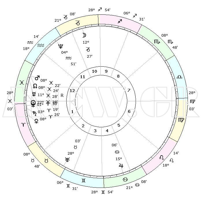 | | ΘΕΣΕΙΣ ΠΛΑΝΗΤΩΝ ΑΣΤΡΟΛΟΓΙΚΟΥ ΧΑΡΤΗ ΤΗΣ ΣΤΙΓΜΗΣ ΑΥΤΗΣ | | | | Πλανήτης | Ζώδιο | Μοίρες | Δεκαήμ. | Σε οίκο | Απόκλιση | | Ακμές των οίκων | | Ηλιος | Ιχθείς | 22°34' | Τρίτο | 1 | 02 S 57 | | 1ος | 21°11' | Υδροχόος | | Σελήνη | Αιγόκερως | 11°39' | Δεύτερο | 11 | 27 S 21 | | 2ος | 06°59' | Κριός | | Ερμής | Ιχθείς | 11°31'R | Δεύτερο | 1 | 04 S 37 | | 3ος | 11°28' | Ταύρος | | Αφροδίτη | Κριός | 08°20' | Πρώτο | 2 | 02 N 17 | | 4ος | 06°50' | Δίδυμοι | | Αρης | Ιχθείς | 08°19' | Πρώτο | 1 | 09 S 28 | | 5ος | 28°37' | Δίδυμοι | | Δίας | Καρκίνος | 15°06' | Δεύτερο | 5 | 22 N 56 | | 6ος | 21°21' | Καρκίνος | | Κρόνος | Κριός | 03°19' | Πρώτο | 1 | 00 S 38 | | 7ος | 21°11' | Λέων | | Ουρανός | Ταύρος | 28°03' | Τρίτο | 3 | 19 N 33 | | 8ος | 06°59' | Ζυγός | | Ποσειδώνας | Κριός | 01°30' | Πρώτο | 1 | 00 S 36 | | 9ος | 11°28' | Σκορπιός | | Πλούτωνας | Υδροχόος | 04°51' | Πρώτο | 12 | 22 S 50 | | 10ος | 06°50' | Τοξότης | | Β. Δεσμός | Ιχθείς | 08°24' | Πρώτο | 1 | 08 S 25 | | 11ος | 28°37' | Τοξότης | | Ωροσκόπος | Υδροχόος | 21°11' | Τρίτο | | | 12ος | 21°21' | Αιγόκερως | | Μεσουράνημα | Τοξότης | 06°50' | Πρώτο | | | |